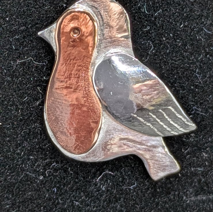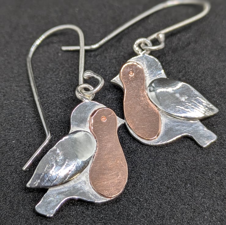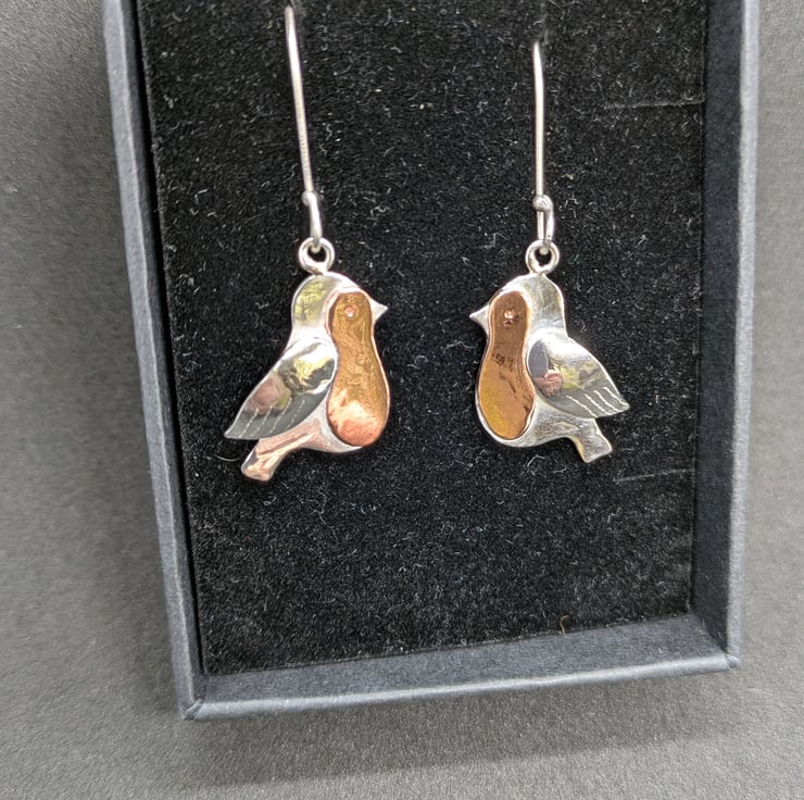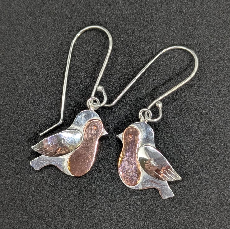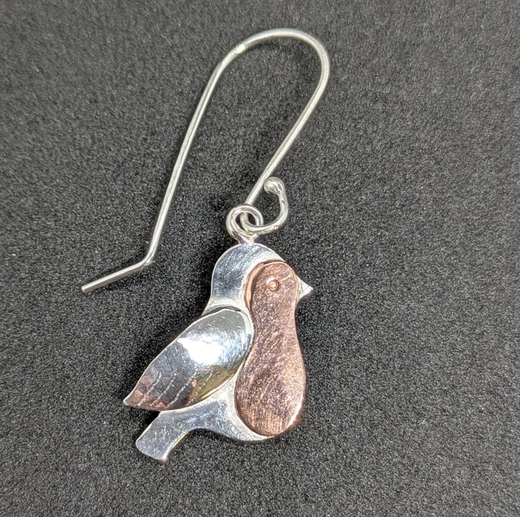 I'm sure I'm not alone in my love of robins. They always seem such bold little birds and I love to use them in my jewellery. These robin earrings are a clean and simple shape but instantly recognisable. They are hand saw pierced from silver sheet with a forged wing and a rich red copper breast. Each robin is approximately 1.8cm tall and 1.7cm wide and the earrings have a drop of 4 cm. They would make an original gift for a bird or nature lover.