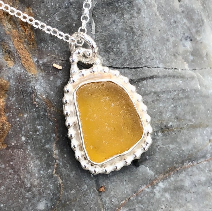 This beautiful piece of honey sea glass was found along the UK's South West coastline and has been set in a fine silver bezel (.999), a decorative bead of silver has been wrapped around the seaglass to give a unique look. A really simple but elegant pendant