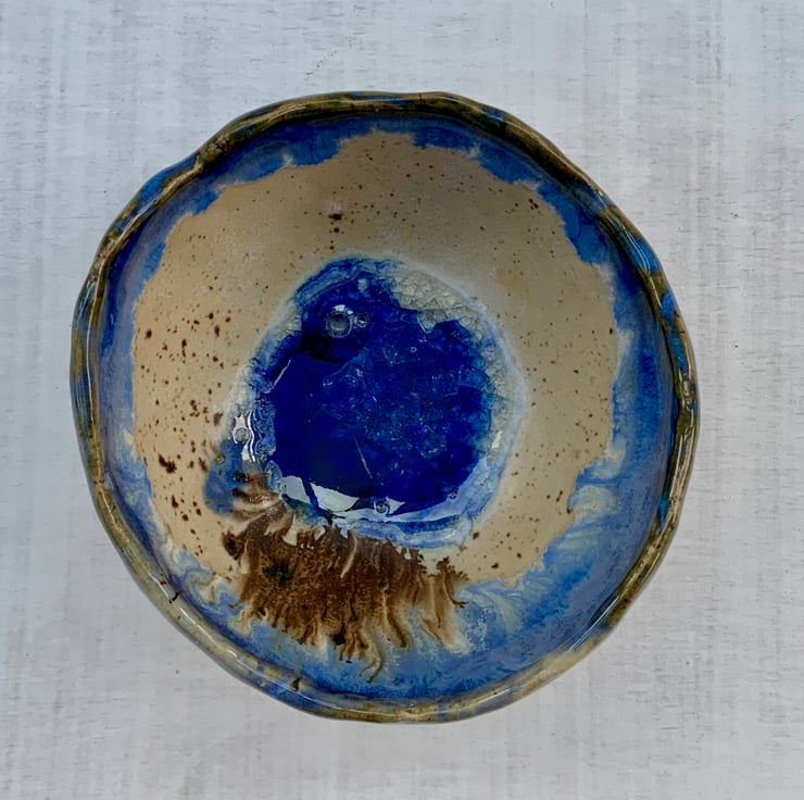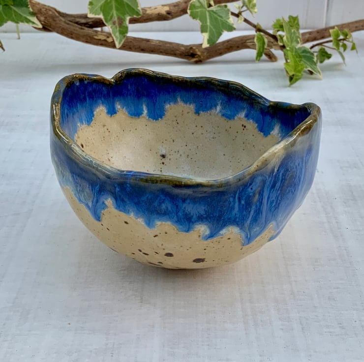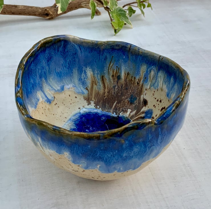 This charming stoneware pinch pot is hand-shaped with care, celebrating the organic beauty of handmade. Glazed in Winter Wood and Midnight Rain, its deep blues and earthy tones flow beautifully together, with a pool of clear glass in the base intensifying this wonderful colour combination. Perfect for holding jewellery or treasured keepsakes — a small piece of art for everyday moments.