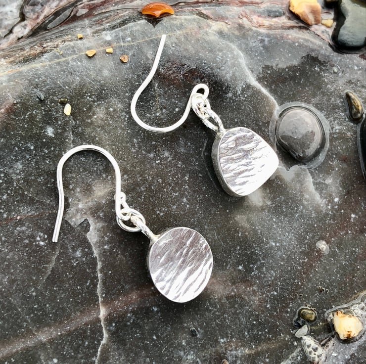 Each piece has been set in a fine silver bezel (.999) and attached to a sterling silver (.925) drop earring setting. These earrings have not been hallmarked.