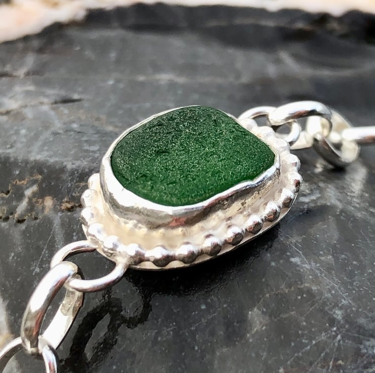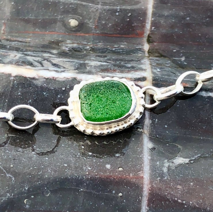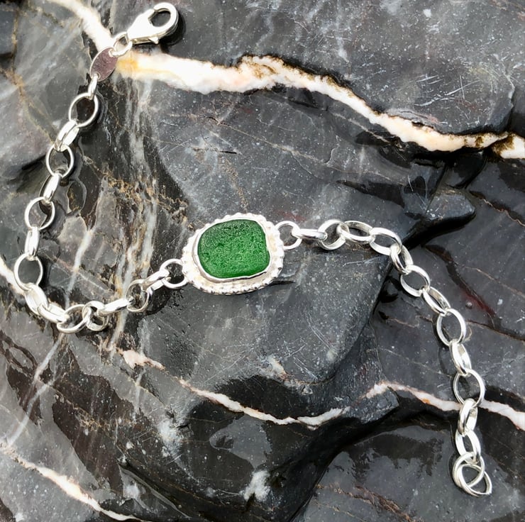 This stunning sea inspired bracelet has been created using a stunning piece of kelly green sea glass
