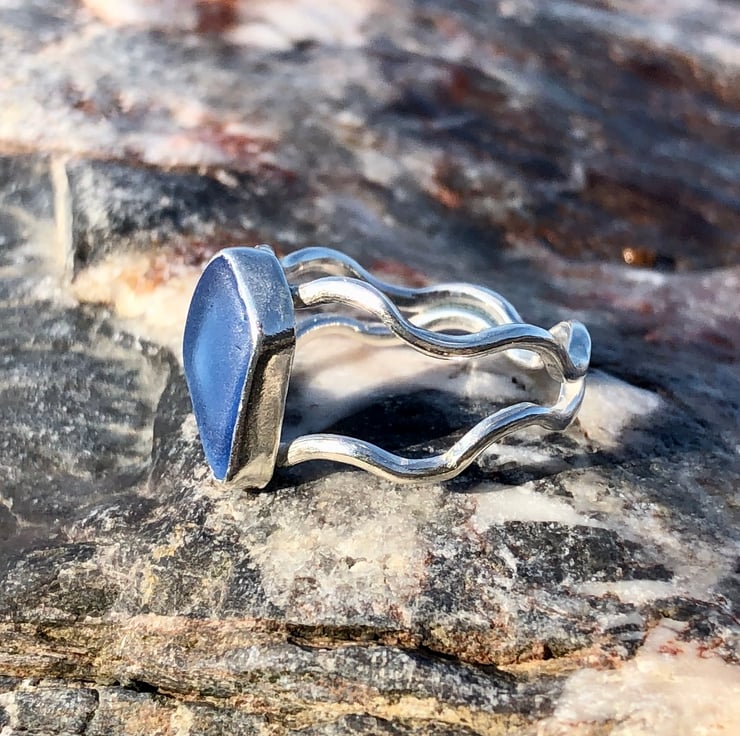 Cornflower Blue Double Wave Sea Glass and Sterling Silver Ring- Size P - 1250