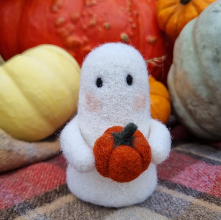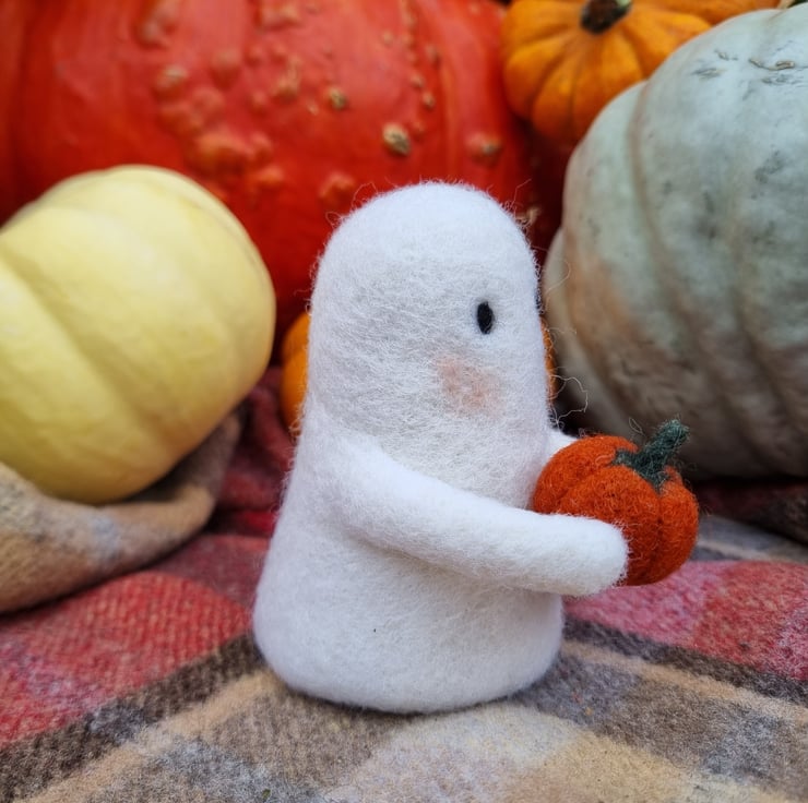 Wooly witchy, needlefelted ghost looking to haunt her forever home! She's awfully tired after a busy day harvesting pumpkins and could use a rest. (No frights, just pumpkin pies!)