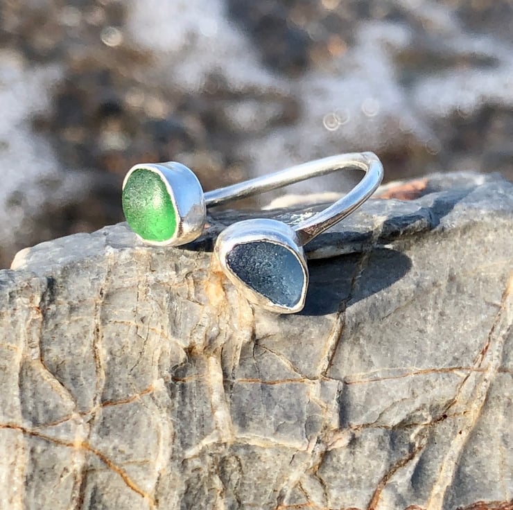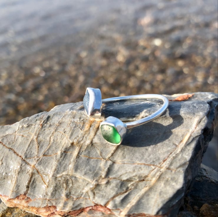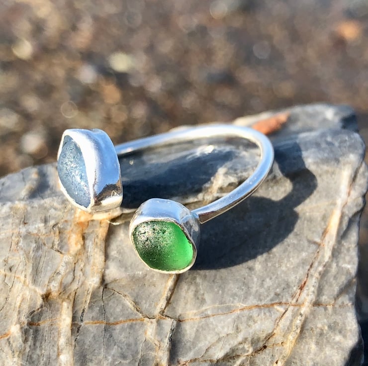 These beautiful pieces of blue and green sea glass was found along the UK's South West coastline and has been set in a fine silver bezel (.999) with a recycled (ecosilver) sterling silver (.925) 1.5 wire to form a unique adjustable silver ring.