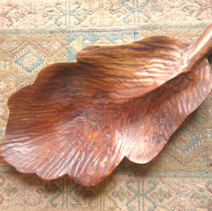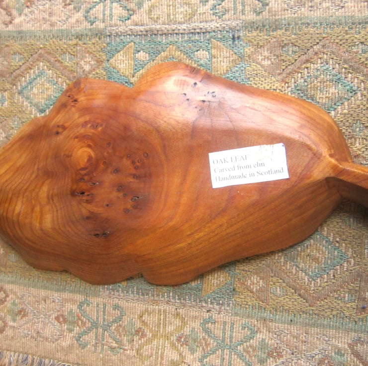 an oak leaf shaped bowl actually carved from burred featured elm measuring 8 inches long.