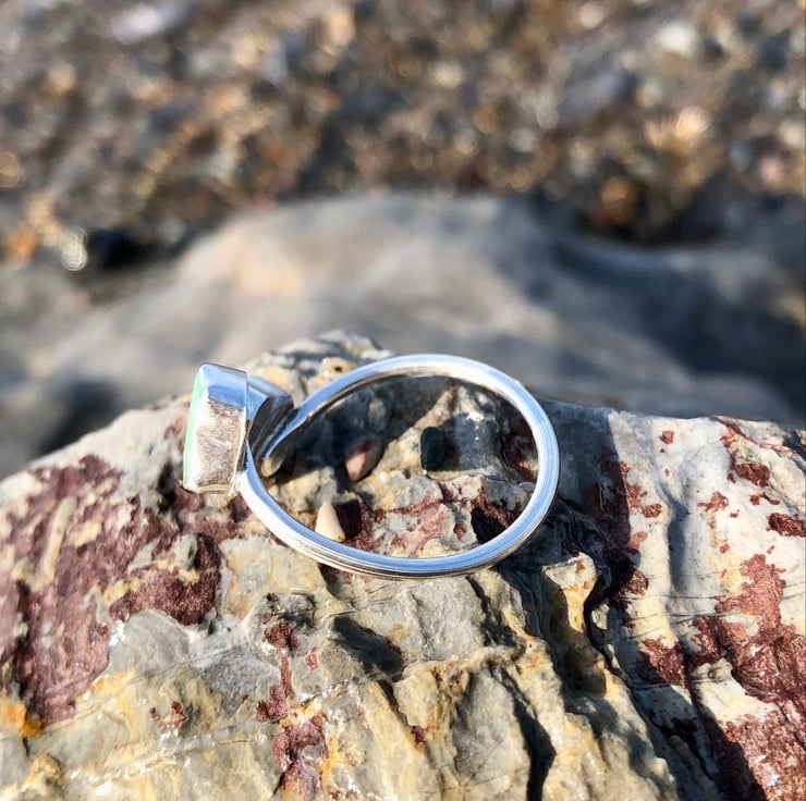 These beautiful pieces of pale aqua and seafoam sea glass was found along the UK's South West coastline and has been set in a fine silver bezel (.999) with a recycled (ecosilver) sterling silver (.925) 1.5 wire to form a unique adjustable silver ring.