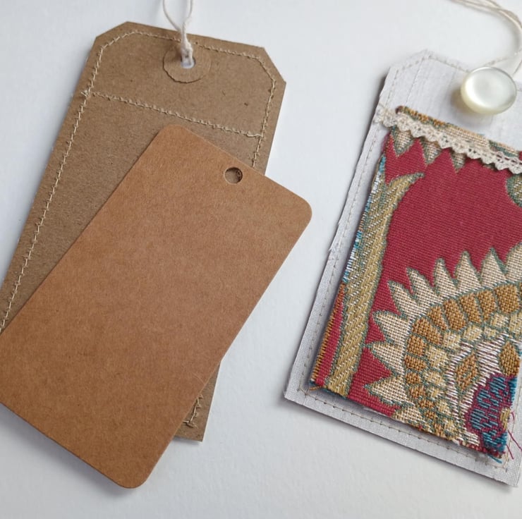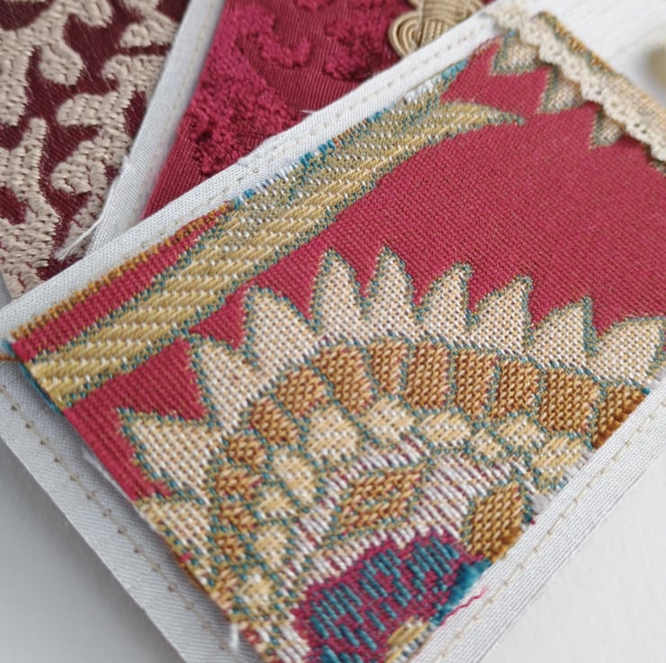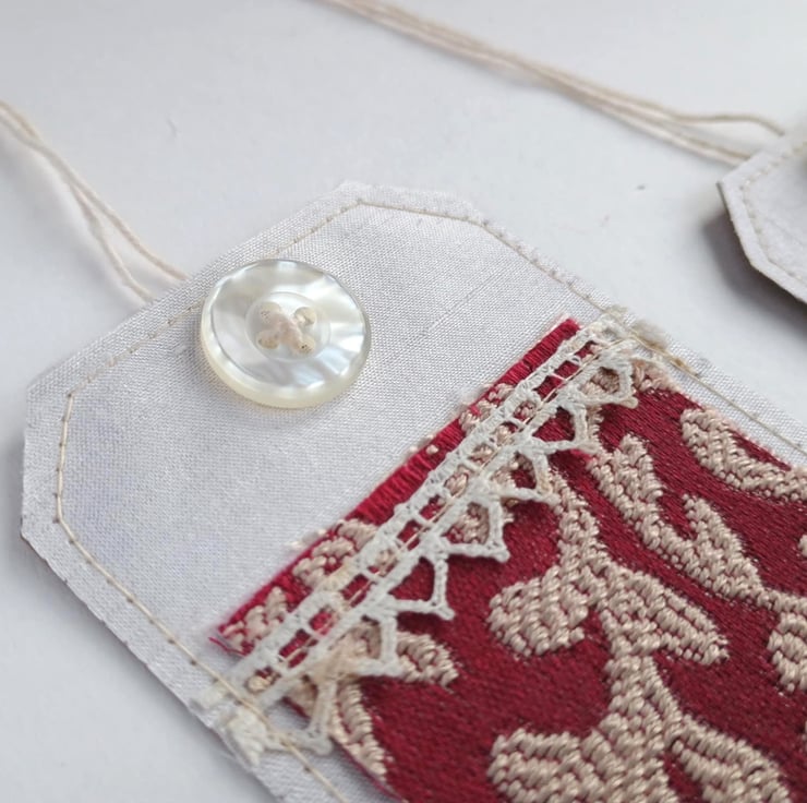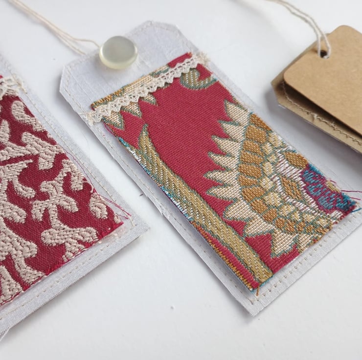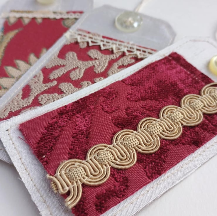Each tag is unique, having a different offcut from the Chalfont collection by iLiv, that I used to make Christmas stockings. The fabrics are beautifully textured, including embossed scrolls, jaquard weave florals and flocked velvet in mixed fabrics.