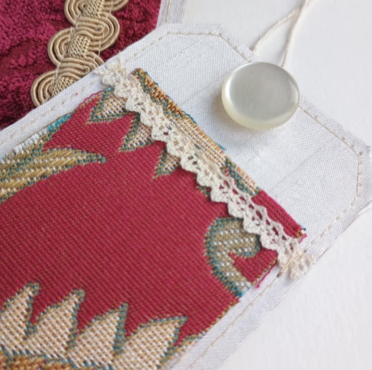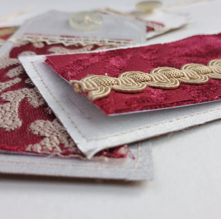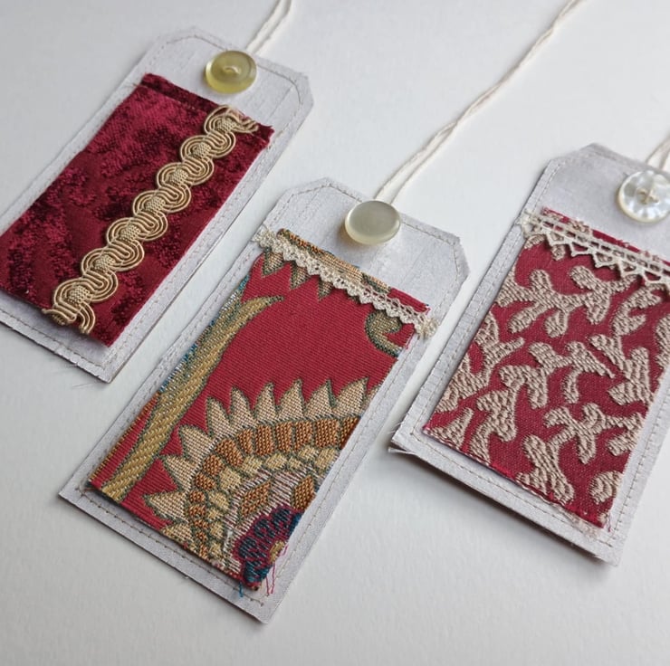 Three beautiful gift tags in an Arts and Crafts style. Zero waste - these carmine red and muted gold tags use recycled and salvaged textiles, and come with a smaller detachable card tags that can be replaced - so you can reuse them many times. Perfect for adding a little luxury trim to a special gift at Christmas or any time of the year.