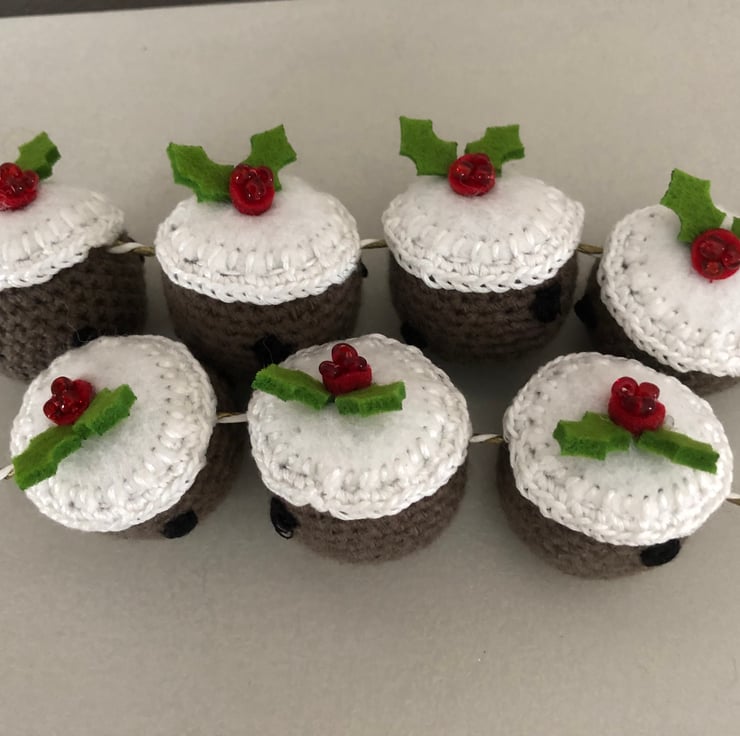 A garland of 7 cute and beautifully handcrafted Christmas puddings made from crocheted cotton and felt with hand embroidered and beaded detail. The puddings measure 4cm x 4cm and are strung together on a gold and white striped paper twine. The overall length of the garland measures 2 metres which can be adjusted. The puddings can be moved along the twine and spaced accordingly to suit the hanging space they are intended for.