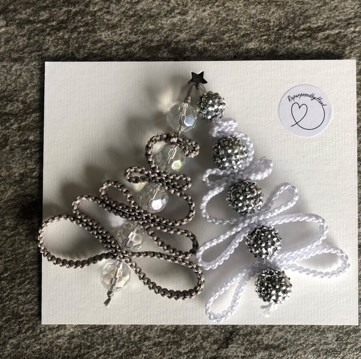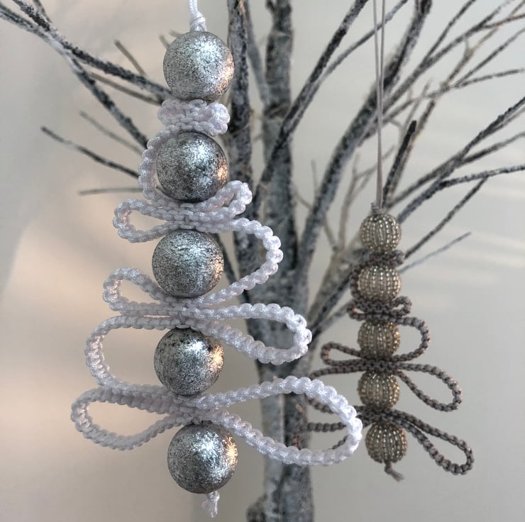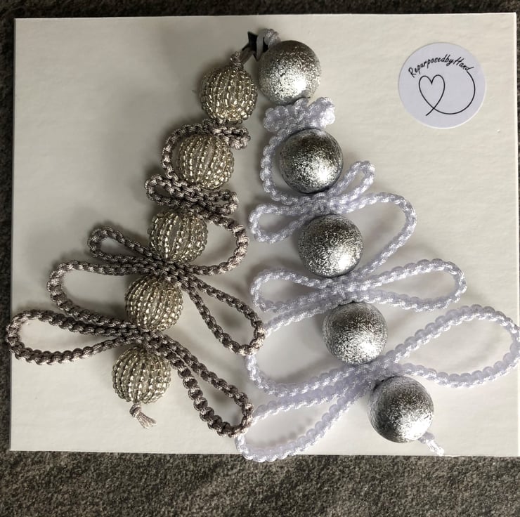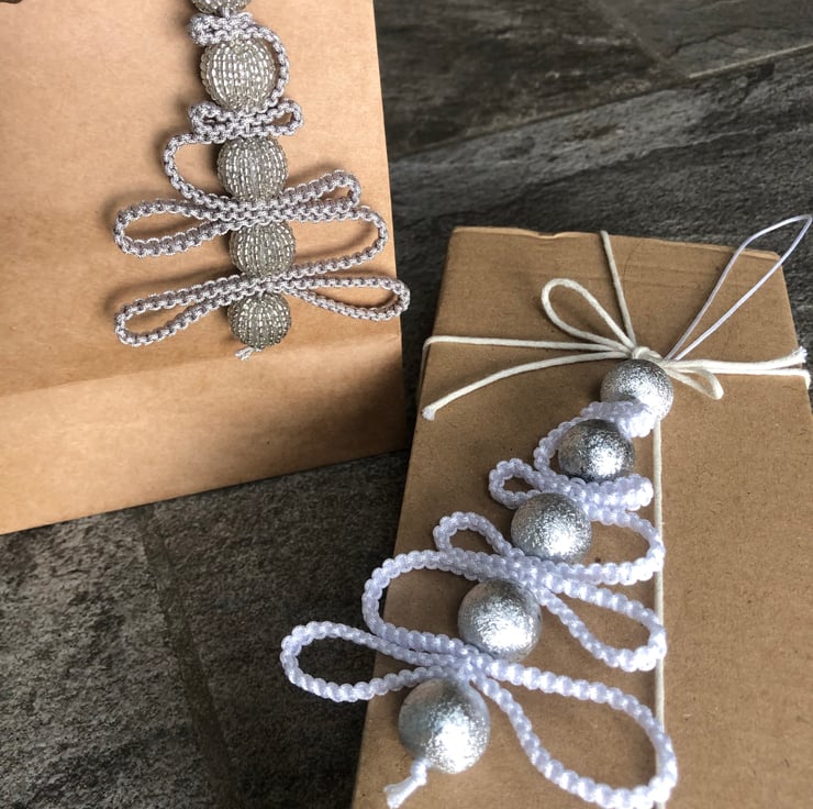 Each christmas tree is made from a silver or white knotted nylon cord and decorated with assorted sparkly beads. The trees measure 10-11cm (height) and are ideal to decorate the home, a christmas tree or to embellish a christmas gift.