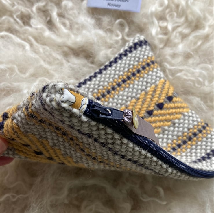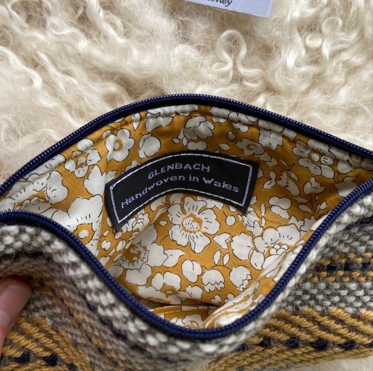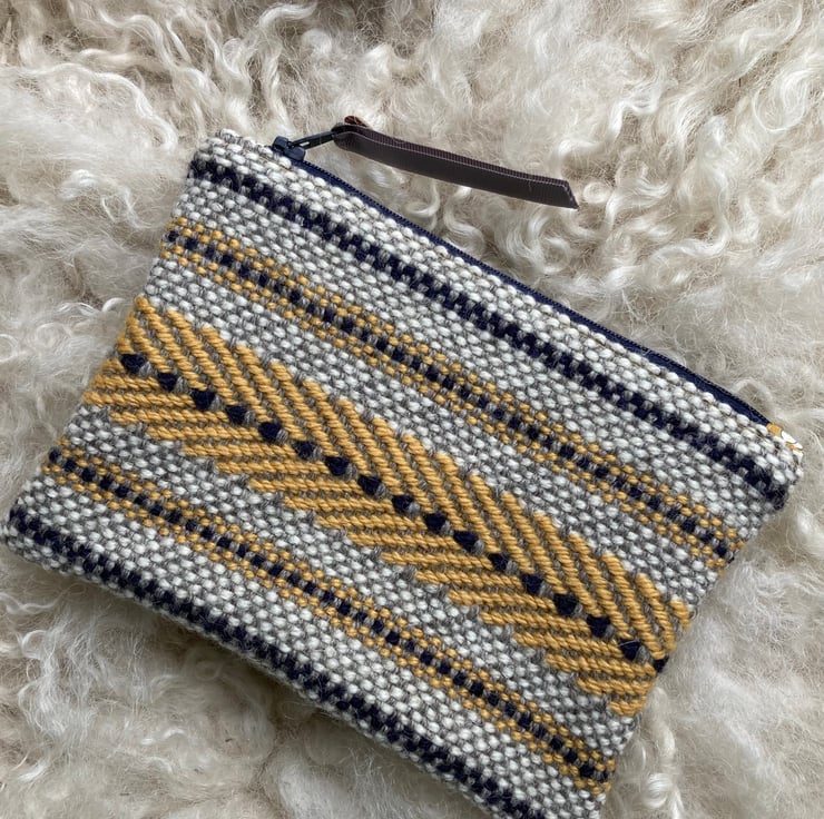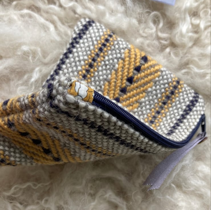 Our Mini pouch is handwoven using the natural shades of grey and ecru wool with a contrast of honey yellow & navy blue - all British wool.