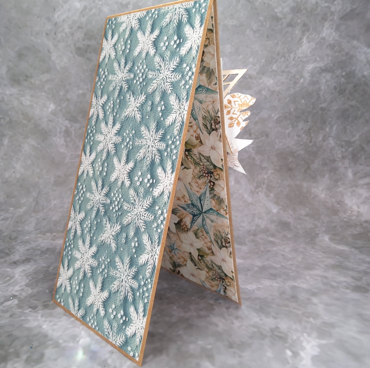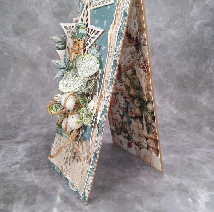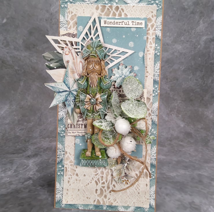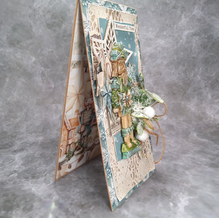 This unique, handcrafted Christmas card features a beautifully sculpted nutcracker figure, cast from a silicone mould and hand-painted to match the tones of the coordinating scrapbooking paper collection. The card opens vertically and offers an elegant, layered festive design with winter florals and star details.