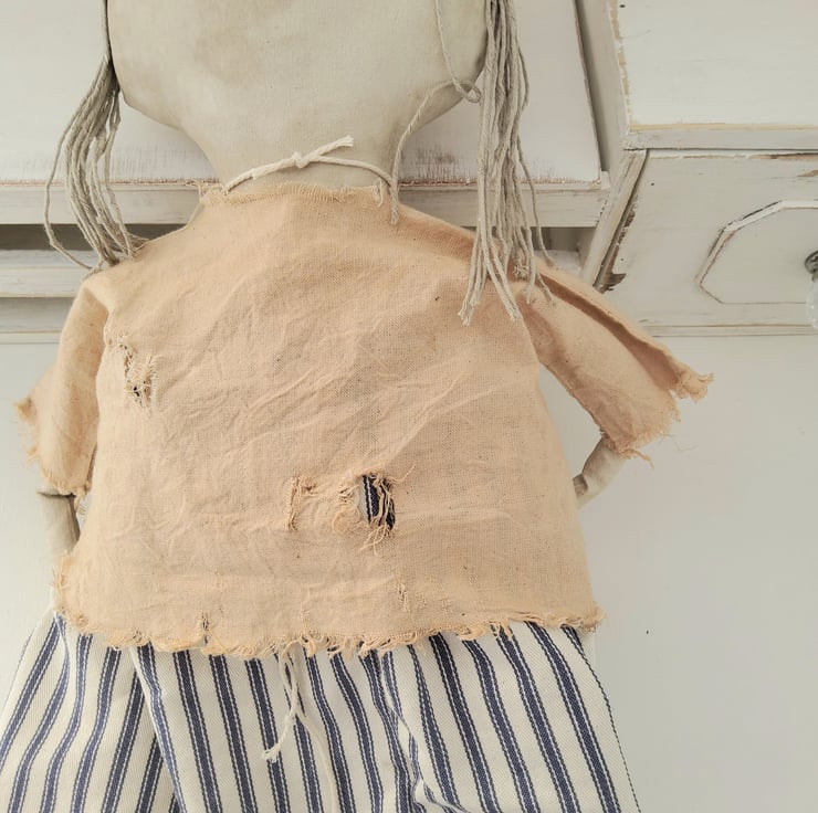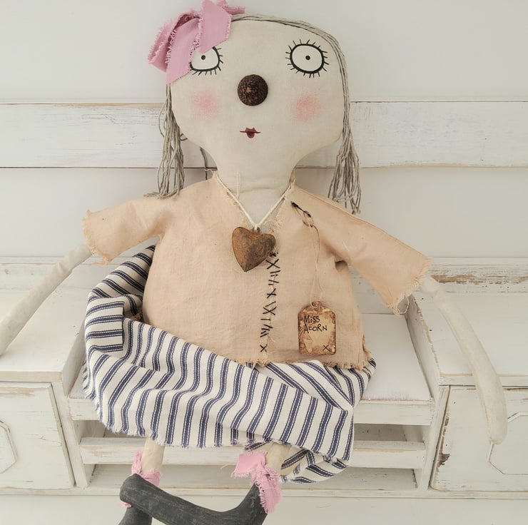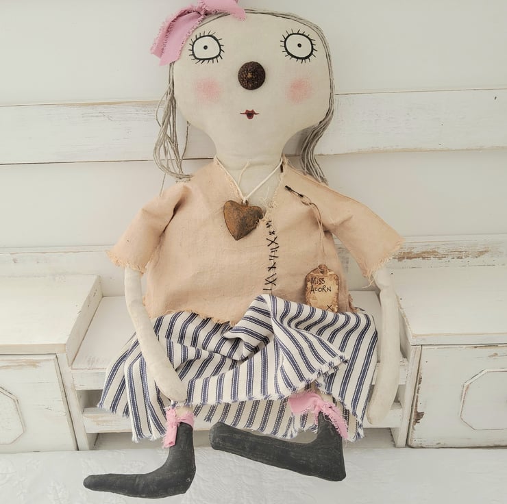 So, Miss Acorn has been made without a pattern - I drew her straight onto calico fabric and then stitched on the draw line - you never actually know how the doll will turn out. She has then been made up and the doll then painted with white acrylic paint, then sanded and given a light coffee wash. Her features are also painted and her hair is linen yarn. Her clothes are all cotton and the blouse has been distressed. She wears a pair of big pants for reasons of modesty.