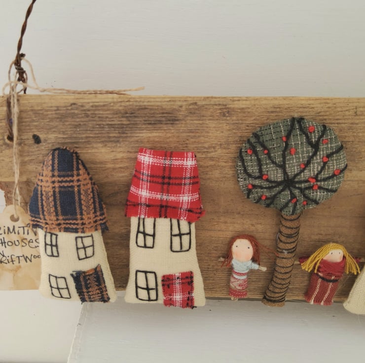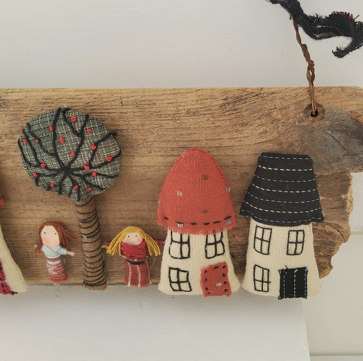 All the little houses have been hand stitched using vintage linen for the body of the houses and assorted cotton for the roof and doors. The visible stitching has been done with embroidery thread. The little ladies are tiny and I took my inspiration for them from Guatemalan worry dolls. Mine have been made from papier mache and wrapped with embroidery thread and fabric. The hanger is rusty twisted wire.