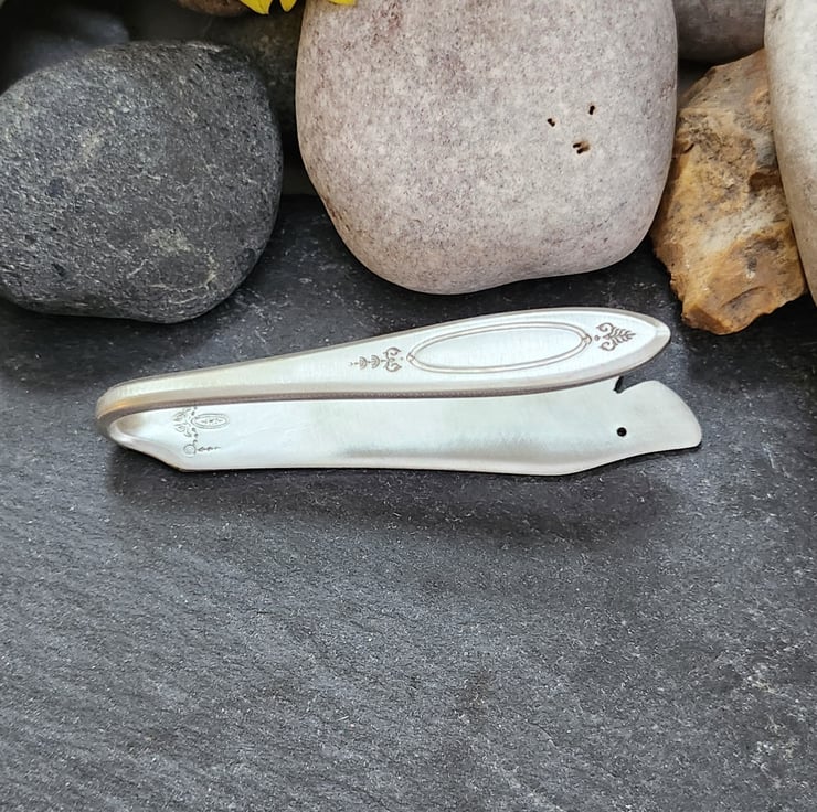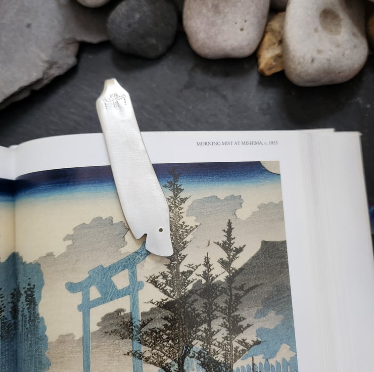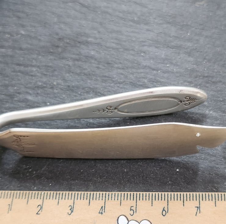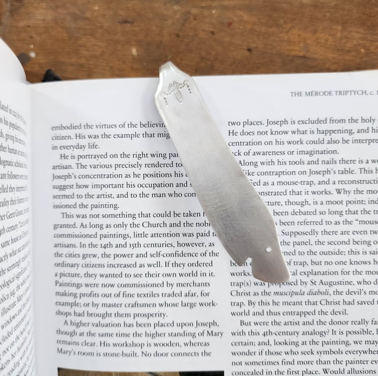 A bookmark in the shape of a shark's head. Cut from a 1917 vintage silverplated stainless steel Adam pattern fish knife. This version is the complete knife, folded over.