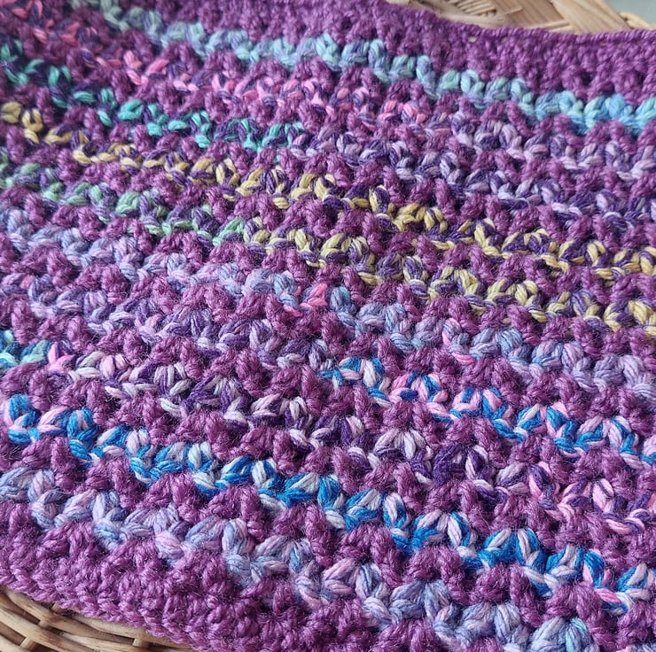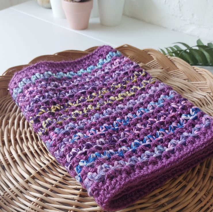 Crocheted from a super soft chunky, speckled acrylic yarn striped with a rich Purple wool and acrylic mix yarn this neck warmer is the perfect way to stay cosy.