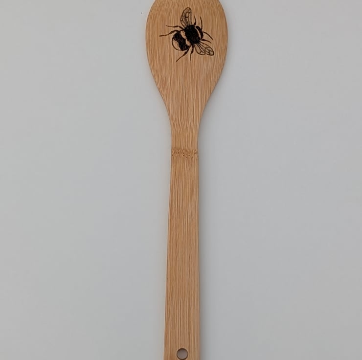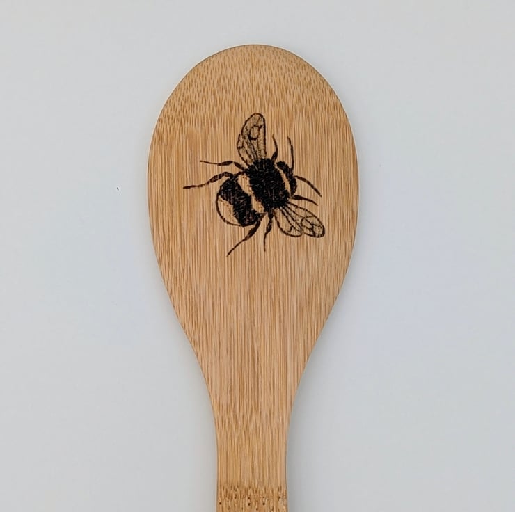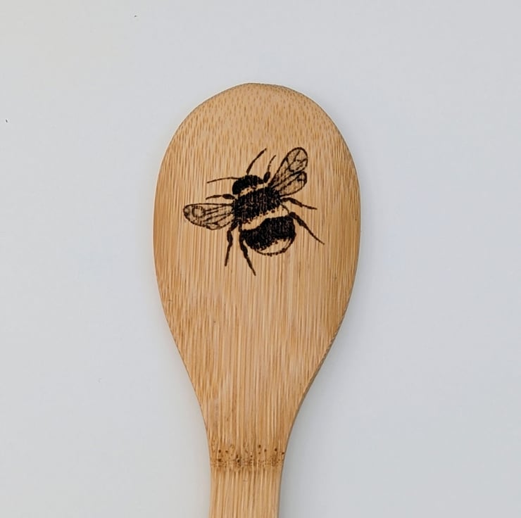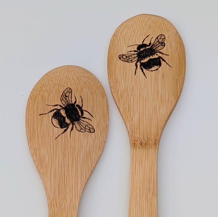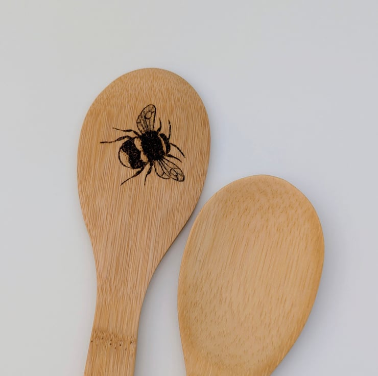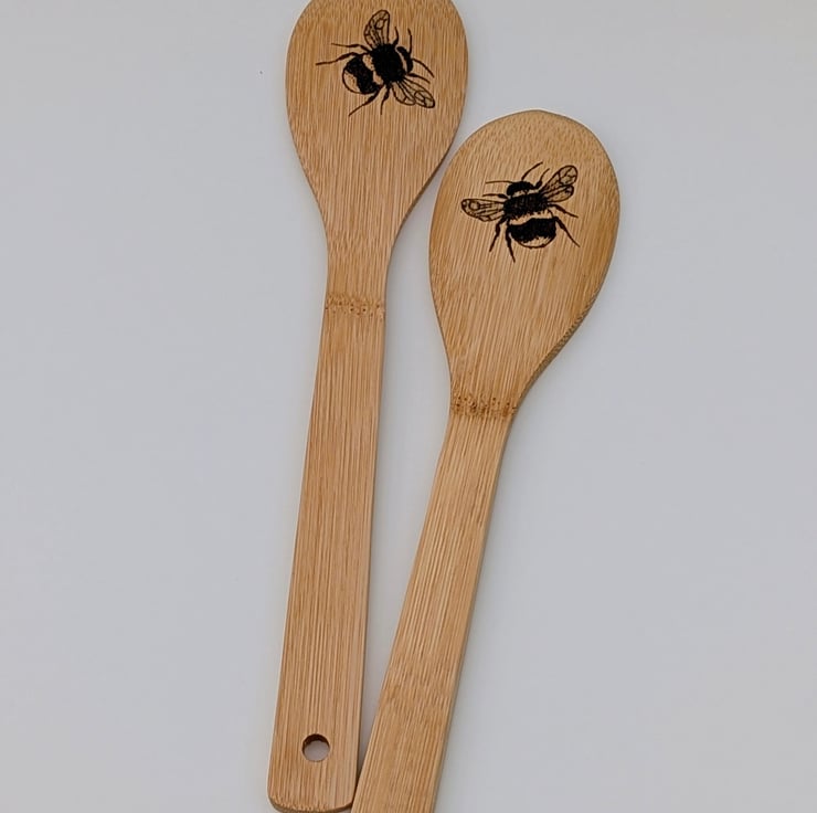 Pair of handburnt wooden spoons, made from bamboo, which have been lovingly wood burned with a beautiful bee on each using the art of pyrography. They would make a unique and useful addition to your kitchen or make a great gift or Christmas stocking filler for a baker or cook or for a bee or nature lover. The spoons have been treated with food grade oil.
