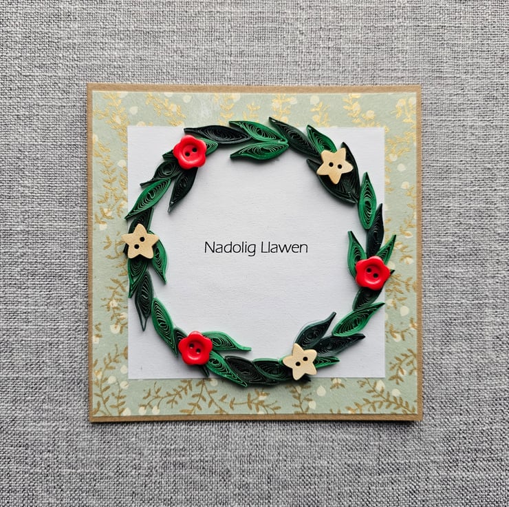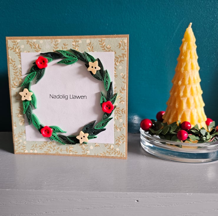 Nadolig Llawen Quilled Wreath Welsh Card with Buttons Size 5" x 5" (12.5cm x 12.