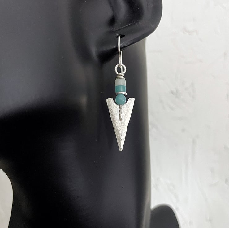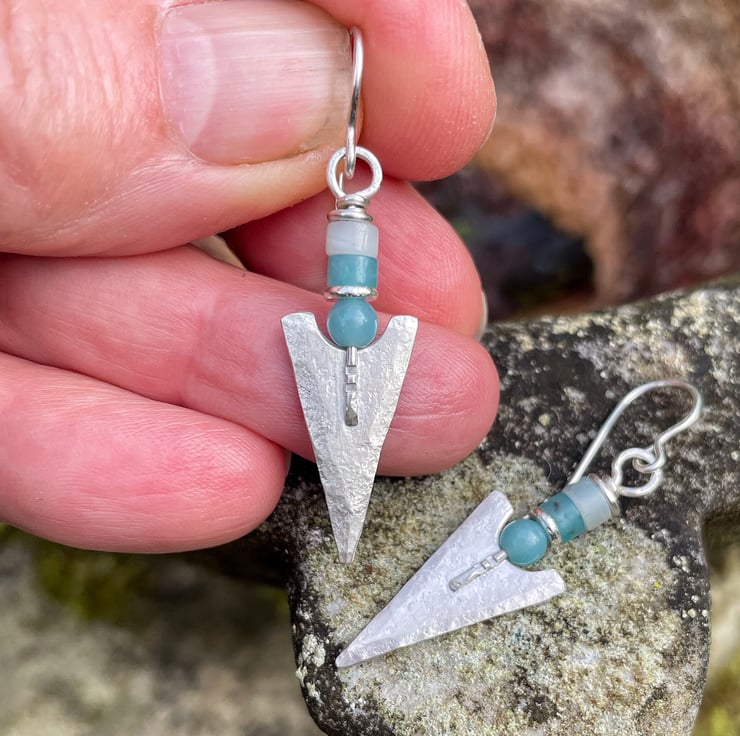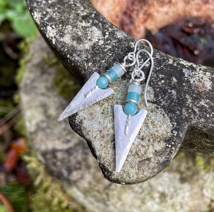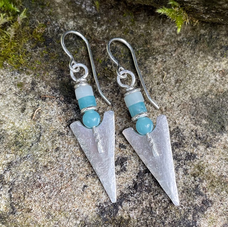 Sterling silver triangular drops have been combined with two tones of aqua blue amazonite beads .