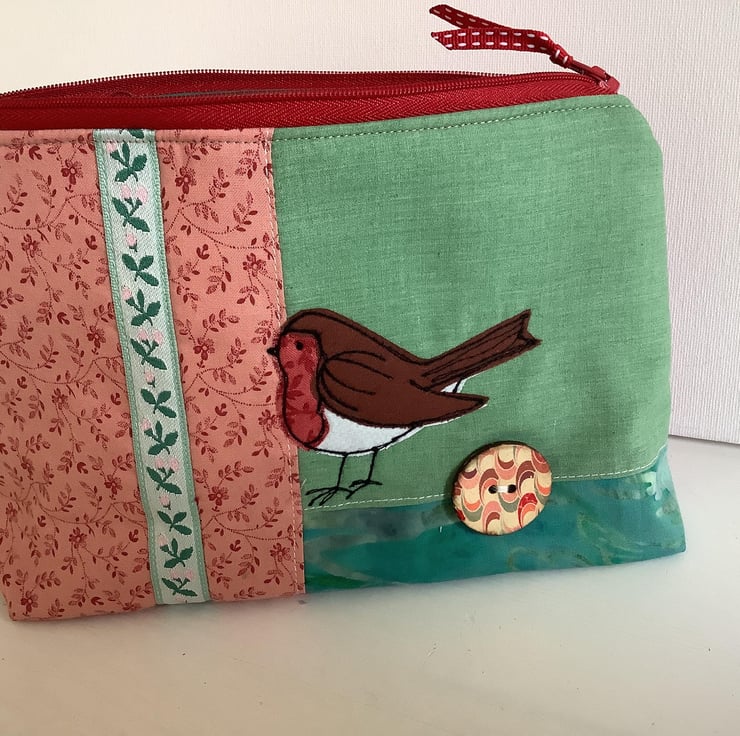 Handmade, exclusively designed cosmetic bag with Robin embroidery