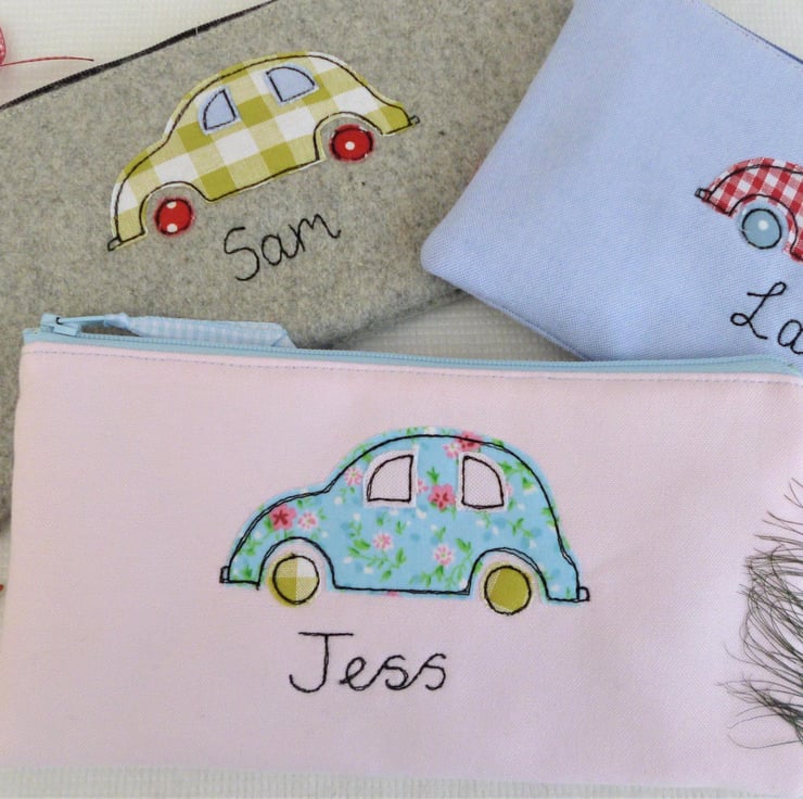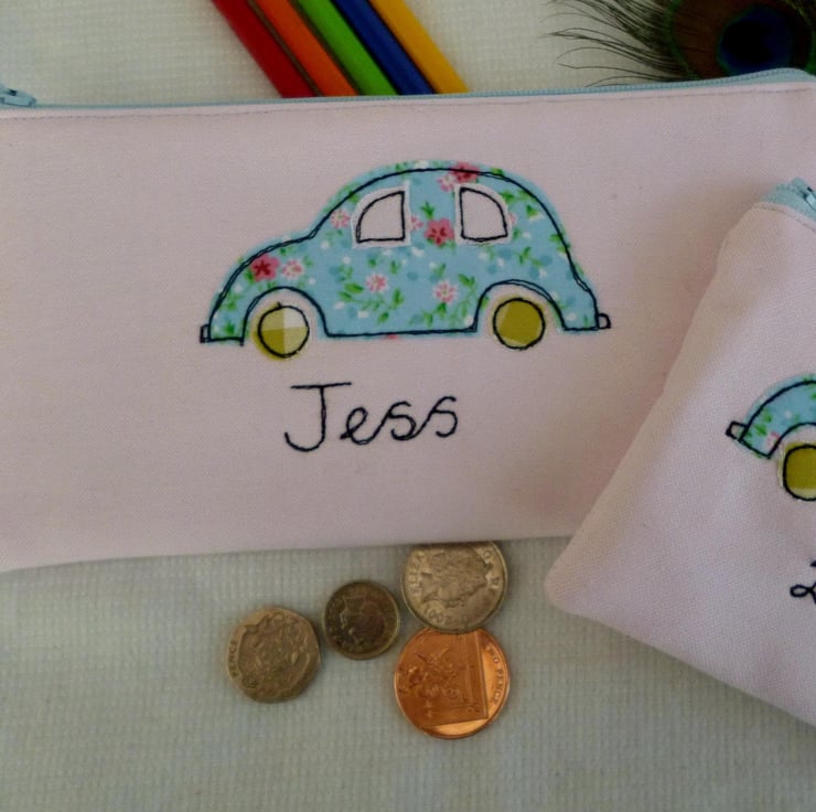 Personalised Car Cosmetic Bag - Custom Floral Car Embroidered on Pink Cotton Mak