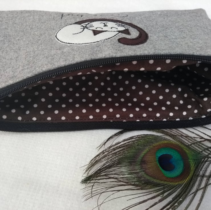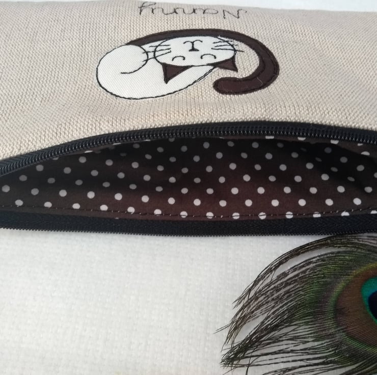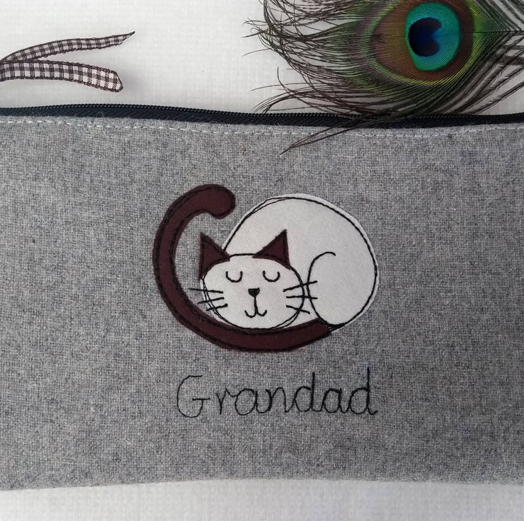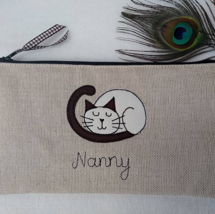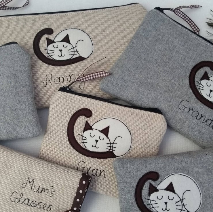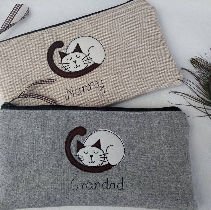 Personalised Sleeping Cat Cosmetic Bag - Customised Grey Wool or Oatmeal Linen