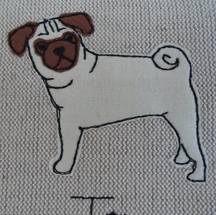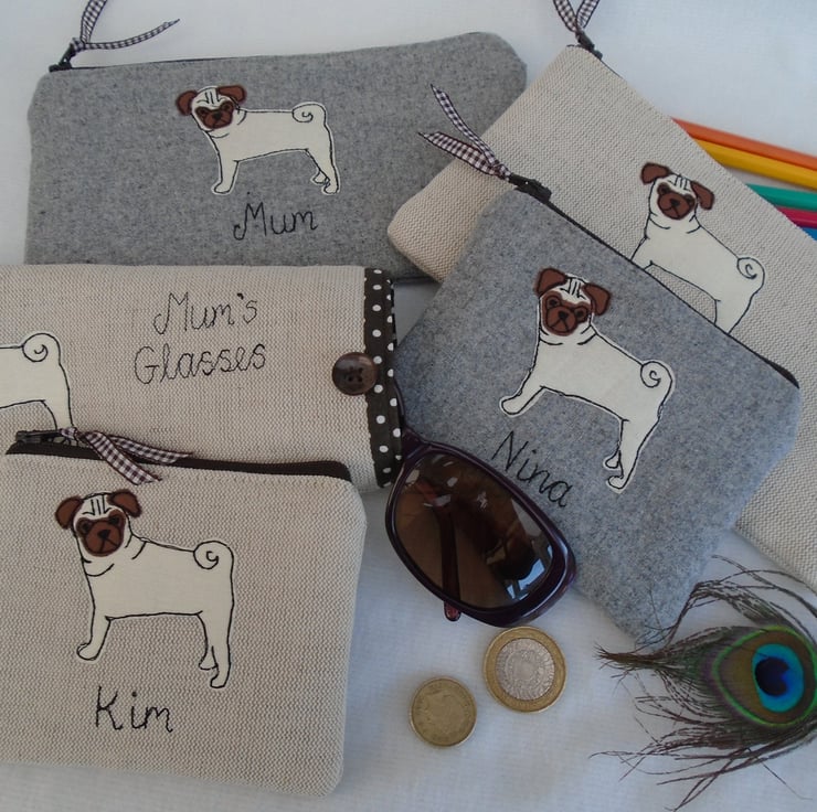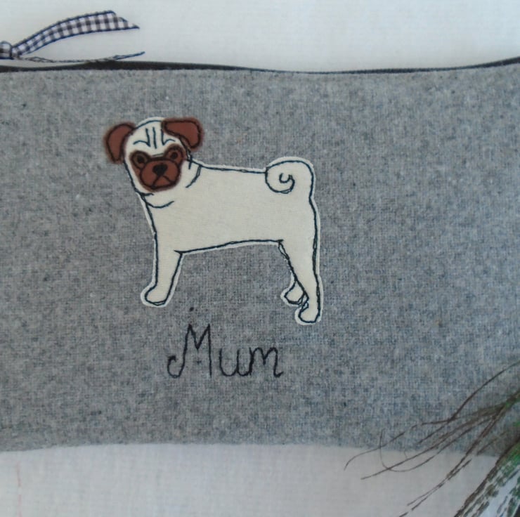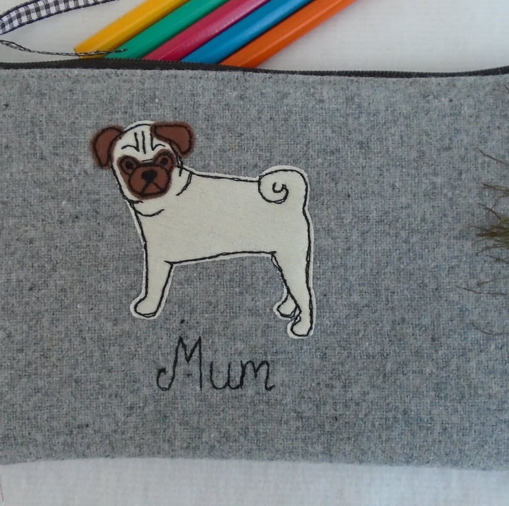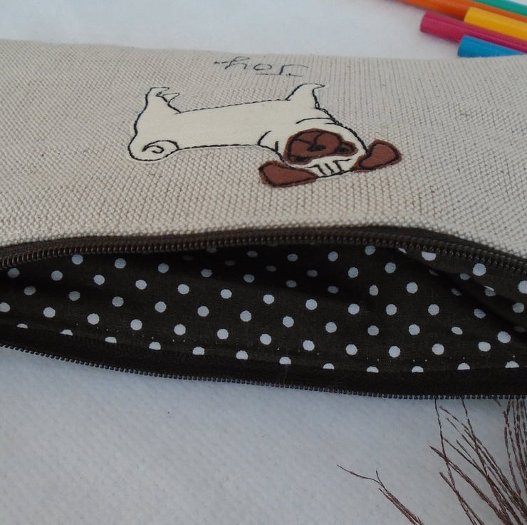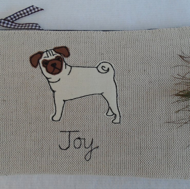 Pug Personalised Pencil Case - Linen or Grey Pen Case with Dog Applique