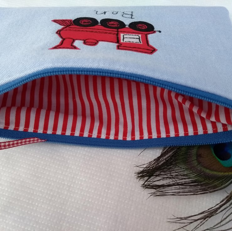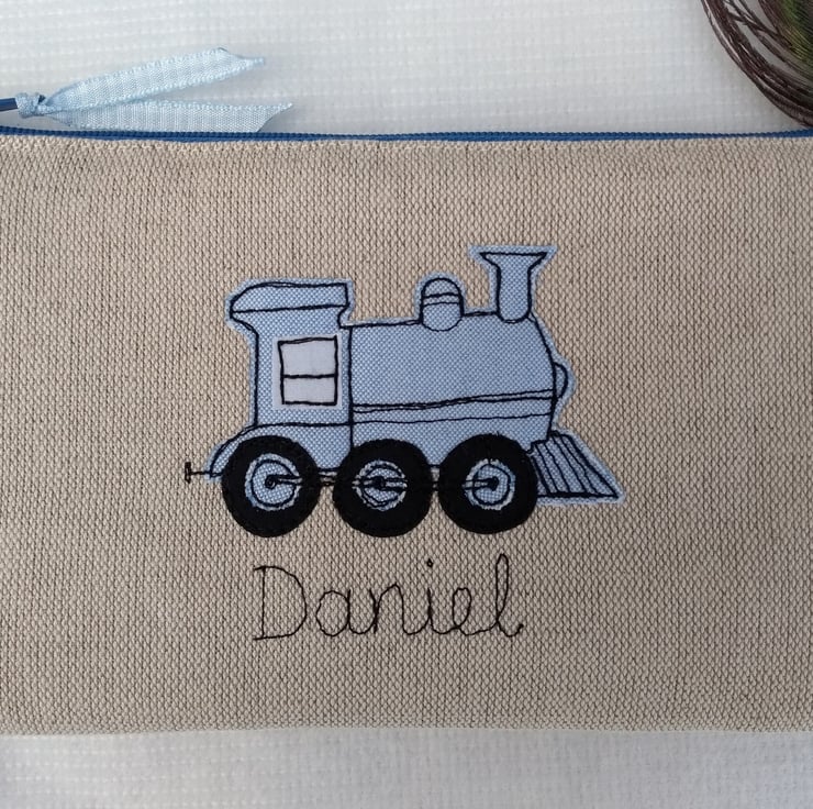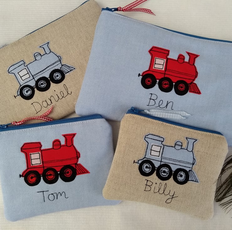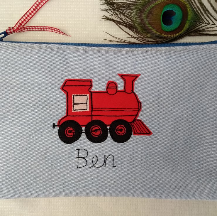 Personalised Train Pencil Case - Blue or Red Fabric Pen Pouch - Steam train gift