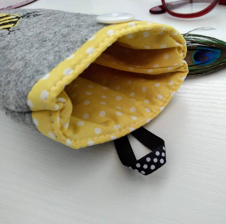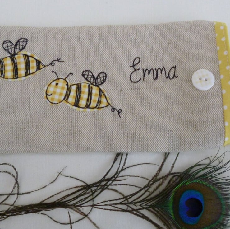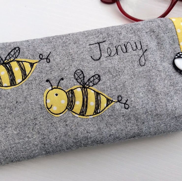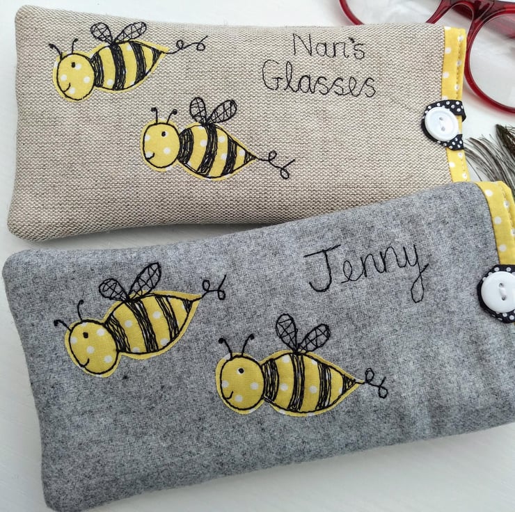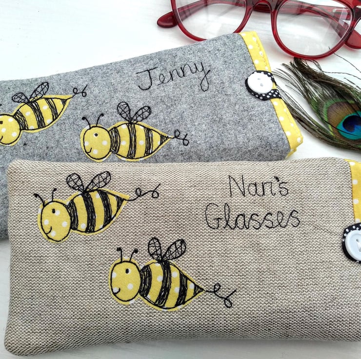 Personalised Bee Glasses Case - Spectacles or Sunglasses Pouch on Linen or Grey