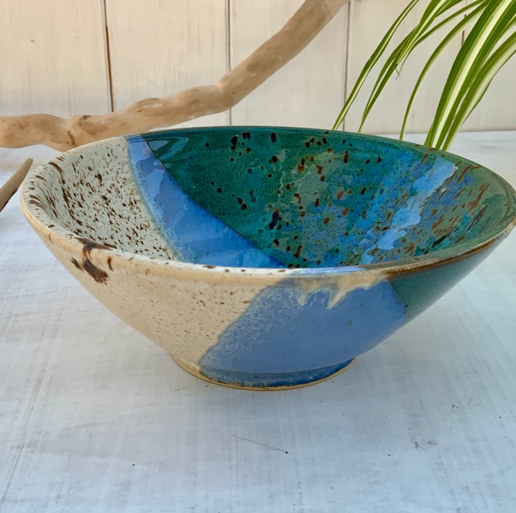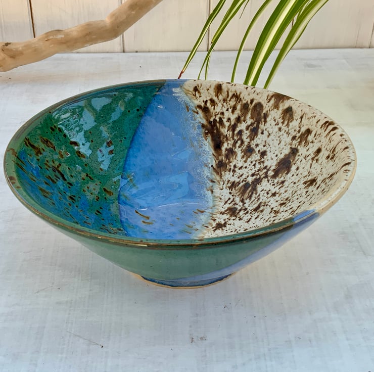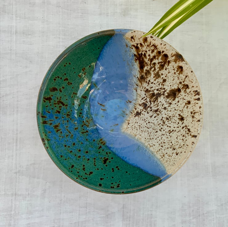 This wheel-thrown stoneware dish is crafted with care and finished in Winter Wood and Midnight Rain glazes. During firing, the two glazes interact beautifully, creating three distinct colours — soft earth tones, deep blue, and sea green — blending in a natural, organic flow. The turned and trimmed foot adds refinement and balance, showcasing the maker’s skill. Each piece is unique, bringing the beauty of handcrafted pottery into your home.
