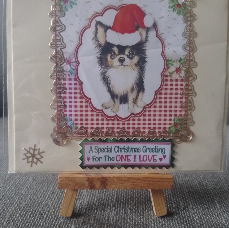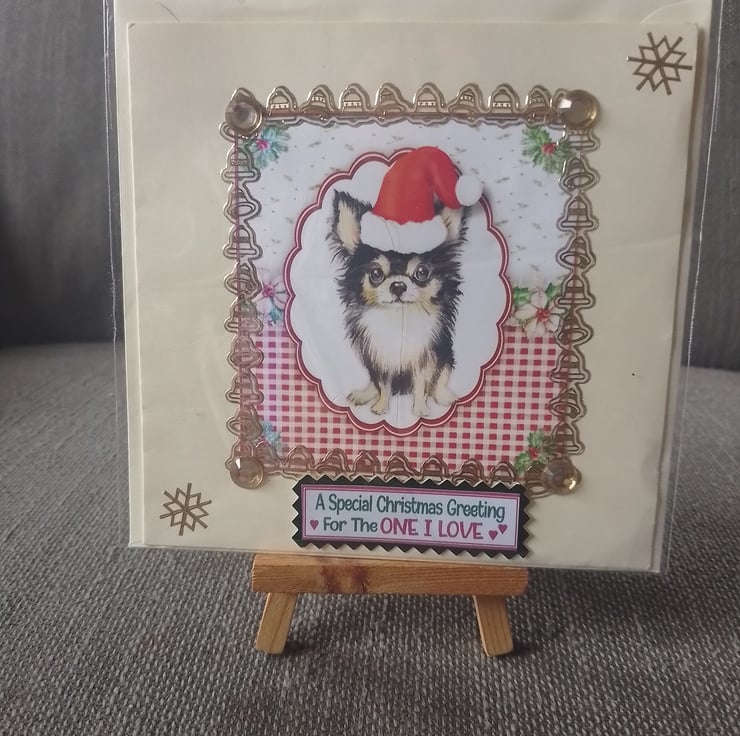 A Christmas card, 6 x 6 yellow card depicting a Chihuahua at Christmas time, all cards come with matching envelopes and are cellophane-wrapped to keep them clean Chihuahua is looking festive in his Santa hat image is decorated around the edge. greeting is a sentiment to the one I love perfect for that special person in the festive season