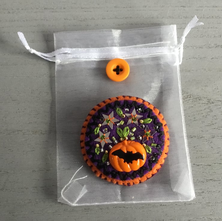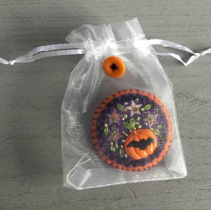 This Halloween Brooch is 2 inches (5 cms) in diameter. A metal brooch pin with a safety catch for secure wear is sewn onto the back. The brooch is gift wrapped in an organza bag, decorated with an orange button. Also a protective bag to keep the brooch in when not worn.