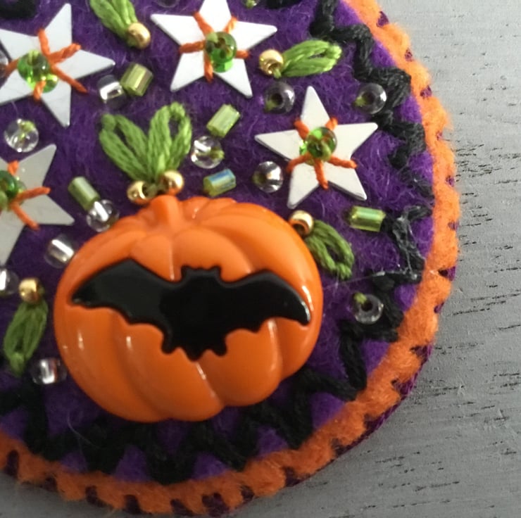 This Hand Embroidered Halloween Bat Brooch has a Halloween scene…..an orange Pumpkin button with a flying Bat motif is sewn onto circles of purple and orange felt, under silver sequin stars, green and golden beads.