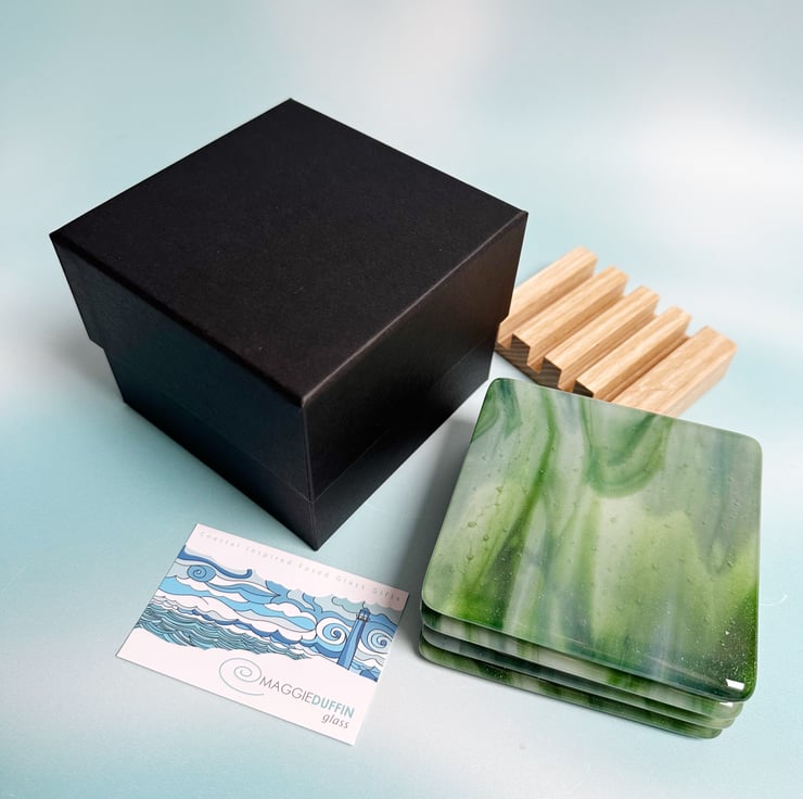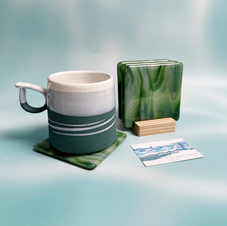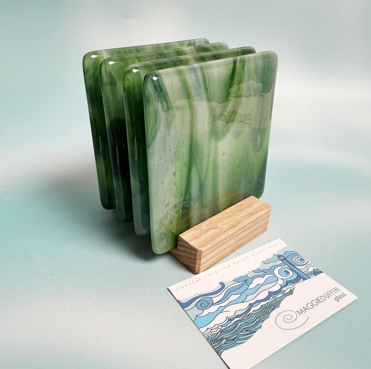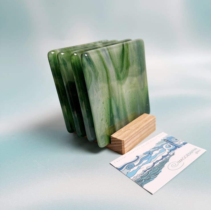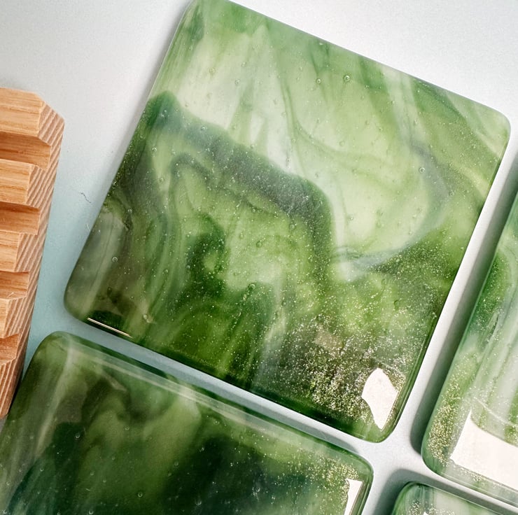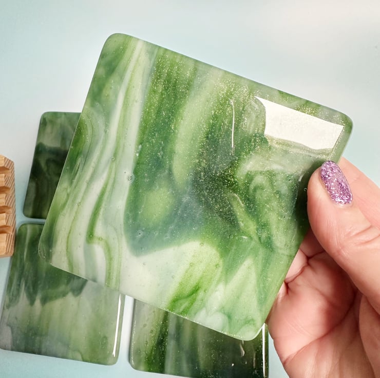 Base glass is called adventurine green and white streaky. It has a wonderful sparkle within it. Topped with transparent glass and fired in the kiln. Each coaster is slightly different even though they were cut from the same sheet.