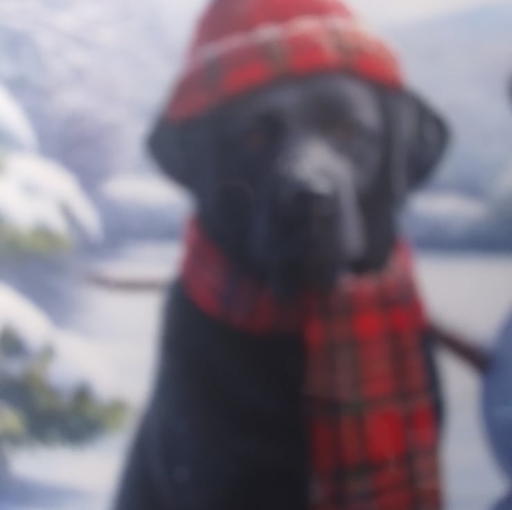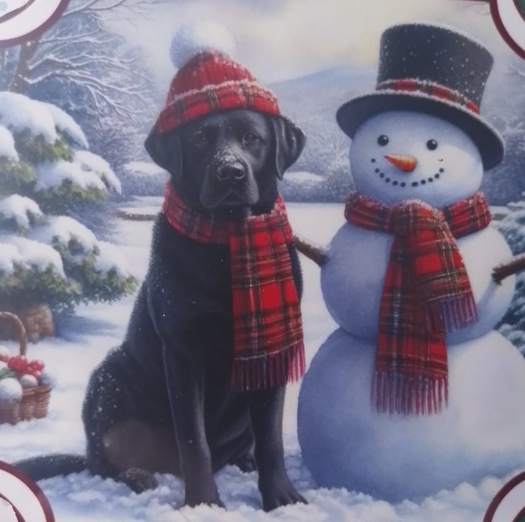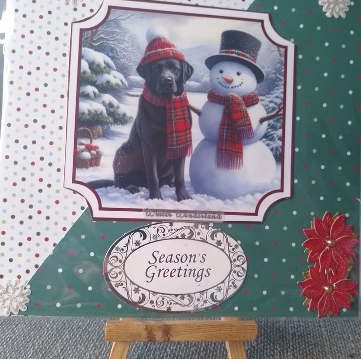 a dog and snowman at Christmas dressed up in the snow, all cards come with matching envelopes and are cellophane-wrapped to keep clean. This lovely 8 x 8 inch card is a two colour base with a cute image of a Labrador dressed up for the cold weather and his snowman friend. a great card to send to someone special