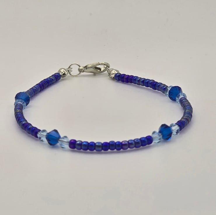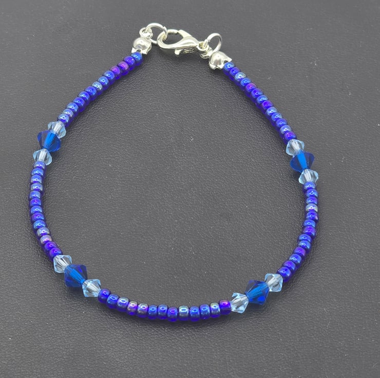 The bracelet has been made using Preciosa crystal Bicones in the colour Capri Blue (5mm) and Aquamarine (4mm). Each section has been divided up using small seed beads in a metallic blue colour. The beads are on a thin beading wire and fastens with a metal silver clasp.