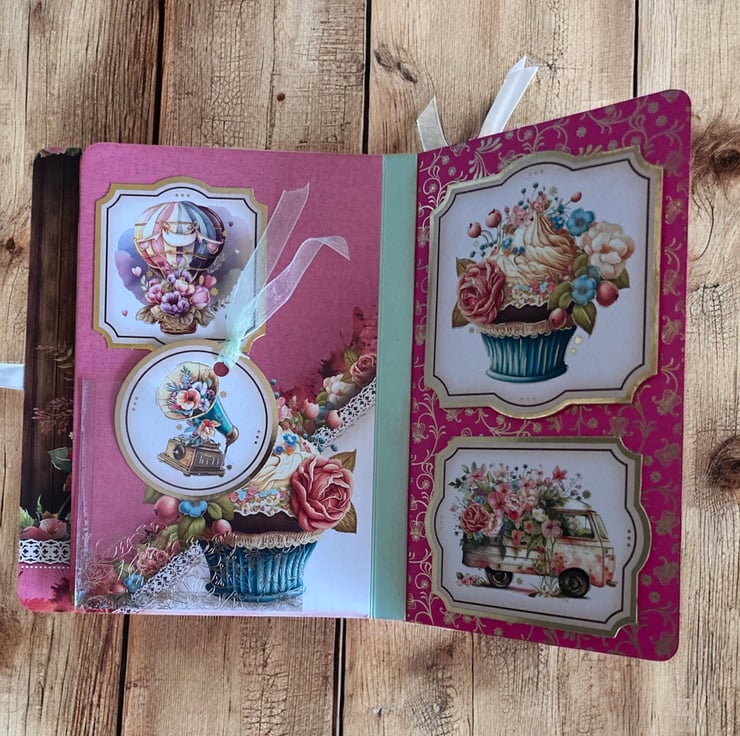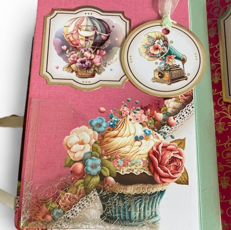 The journal has a floral tea garden theme over its pages — featuring sumptuous images including flowers, birds, cakes, and vintage glass jars.