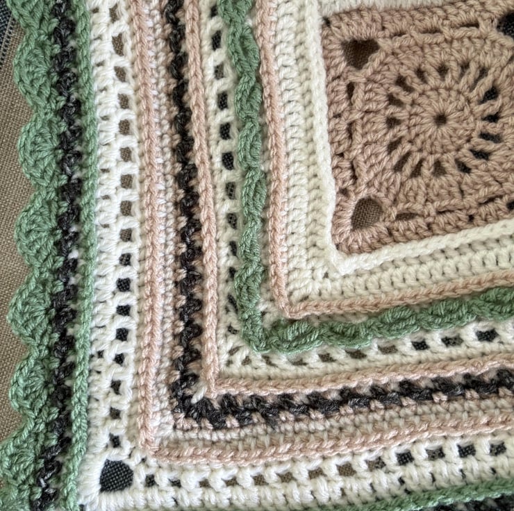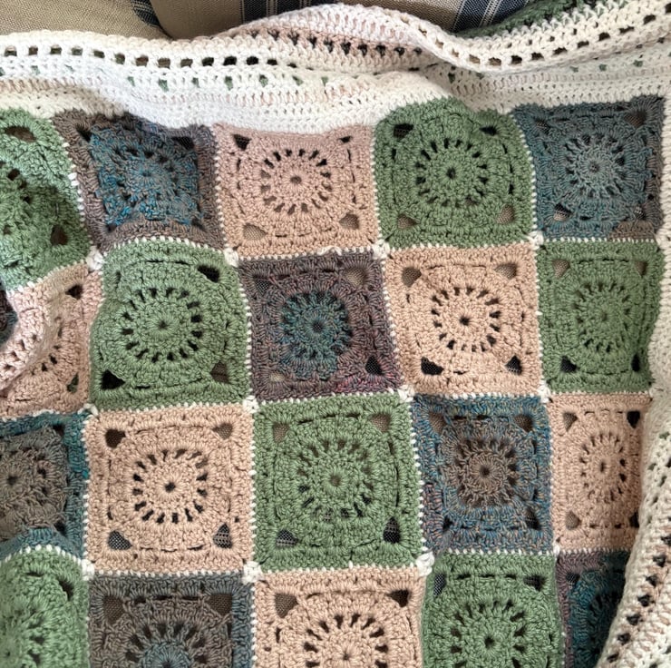 Add a bespoke accent to your interior design this autumn with this beautifully hand made lap blanket in soft shades of green, cream and beige measuring 90 by 80 cm. Constructed of 42 delicately patterned granny squares made from wonderfully soft and warm acrylic yarn, the cosy yet light weight blanket is finished off with a intricate border design and a pale green scalloped edging. Hand wash recommended and reshape whilst damp.