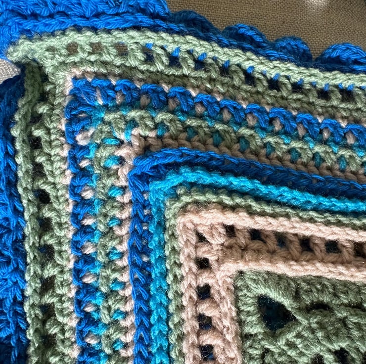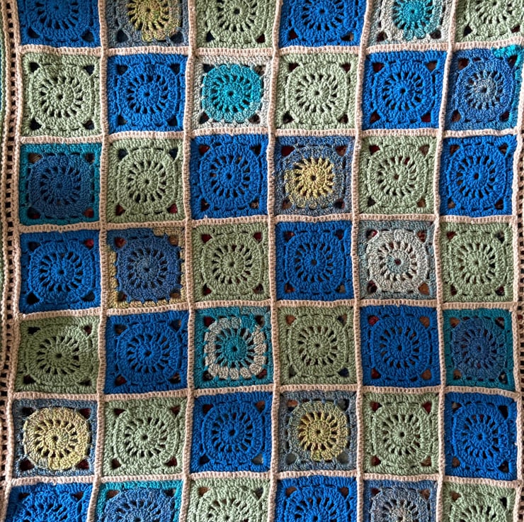 Cosy up with this beautiful soft lap blanket in shades of blue, green and beige measuring 90 by 80 cm. Constructed of 42 intricately patterned granny squares, this exquisite blanket is made from a mix of acrylic and cotton yarns. The cosy yet light weight blanket is finished off with a intricate border design and a bright blue scalloped edging. Hand wash recommended and reshape whilst damp.