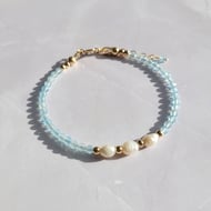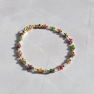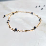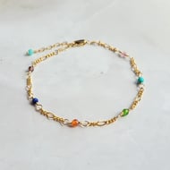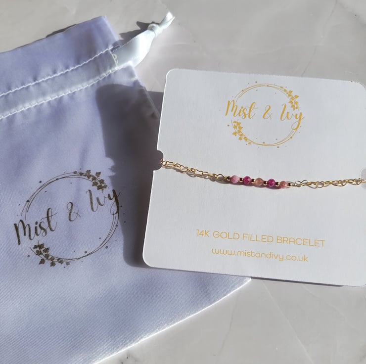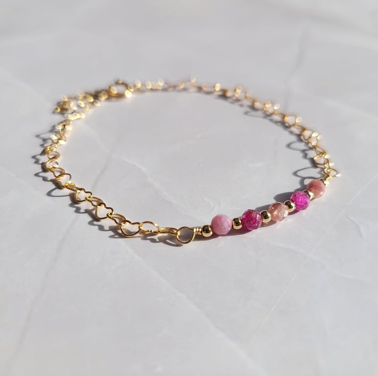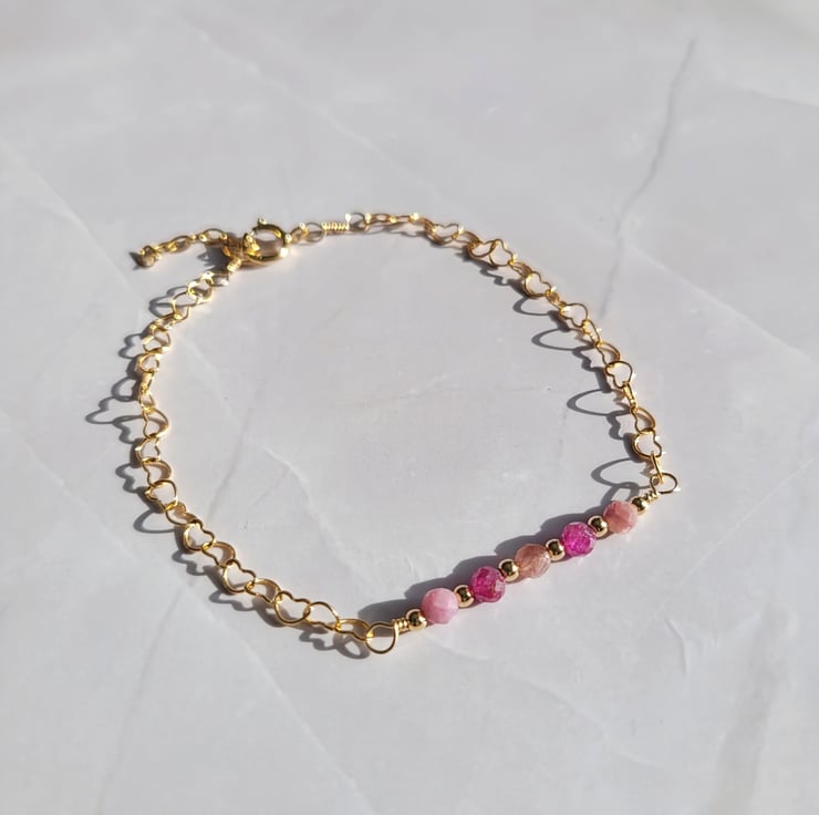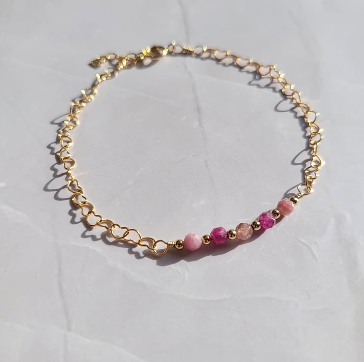 This delicate gemstone bracelet is handmade with ruby and pink tourmaline, spaced with tiny 2mm gold filled beads. The beads and gemstones have been carefully wire wrapped onto a dainty 14kt gold filled heart shaped chain. The gemstones are around 3mm in size. The bracelet has a spring ring clasp and an extension chain giving a variable length of 17.5-20cm.