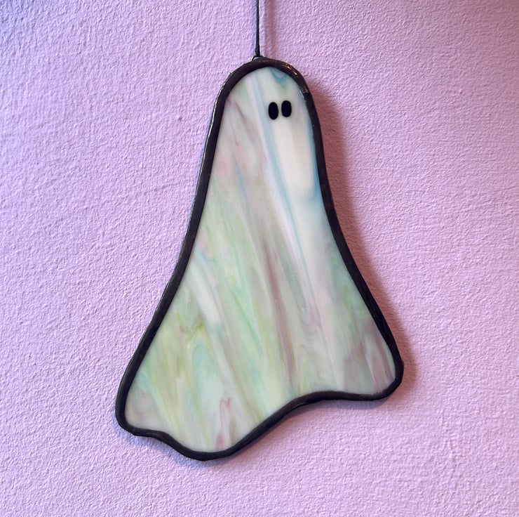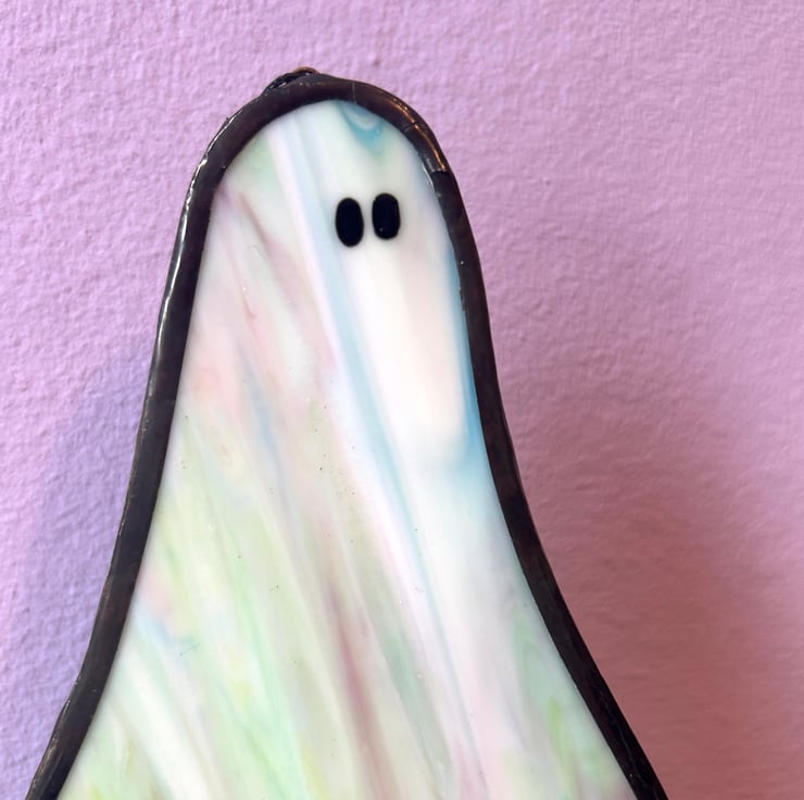 Say hello to your new spooky sidekick. This stained glass ghost is a signature Heather Makes Glass design. Made from high-quality glass, each ghost is totally one-of-a-kind. These cute creeps have tonnes of personality with hand painted faces.