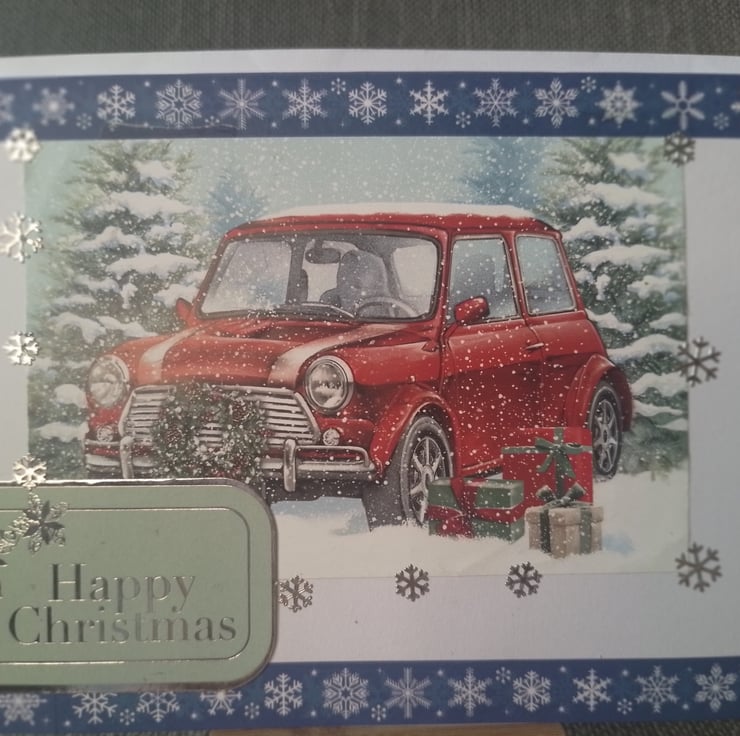 generous sized card features this image of a classic Mini car with lots of gifts driving home to see loved ones for the festive season. Nothing nicer than loved ones arriving to celebrate the festive season.