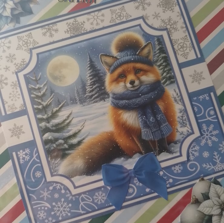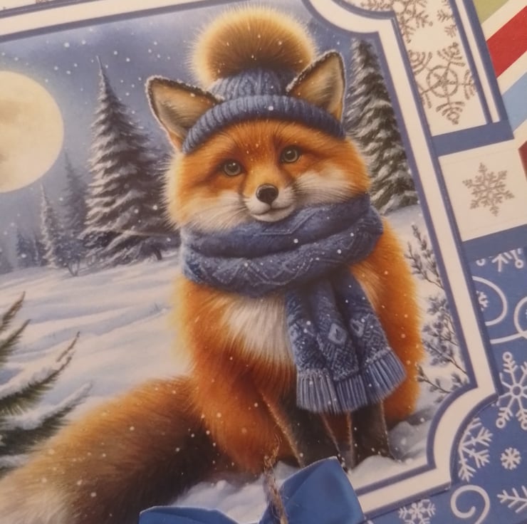 Animals in winter wear look so lovely, and this fox with a hat and scarf looks so cute! I think that a striped background would pick up the blue in the fox image base to match. i think this is a very good fun card