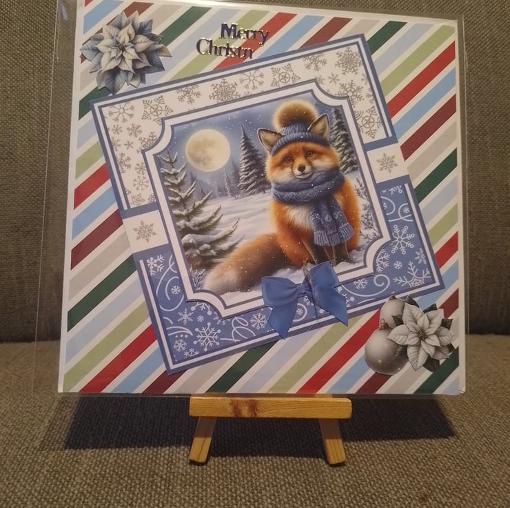 a 8 x 8 inch card depicting a fox wrapped up in the snow at Christmas, all cards come with matching envelopes and are cellophane-wrapped to keep clean. This large card has a jolly striped background and a matching blue base for the fox image. this magnificent fox has on his hat and scarf to keep him warm in the snow. The image has trees and a rising moon in the snow
