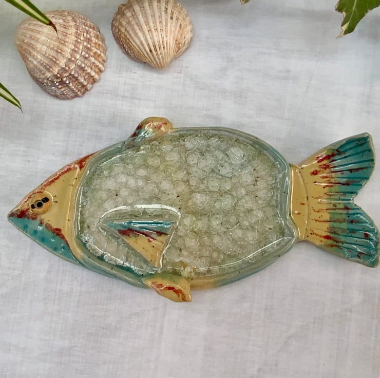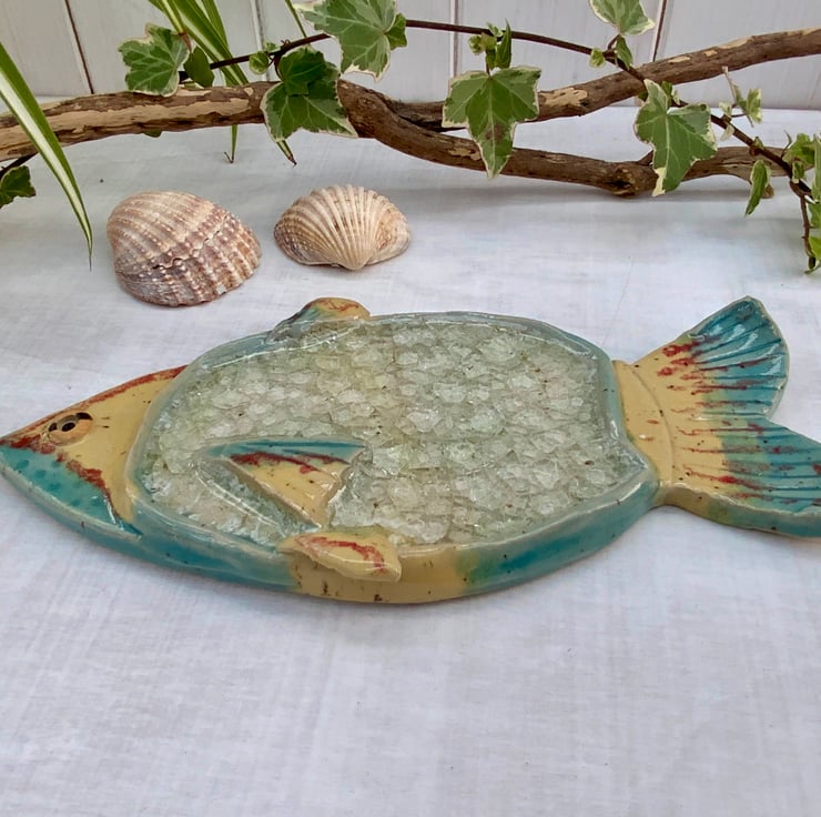 Designed to lay on a flat surface, this cheerful hand-built stoneware ceramic fish adds a splash of seaside charm to any space. Its body is filled with melted glass, creating a shimmering, water-like effect that catches the light beautifully. Each piece is shaped and glazed by hand, making it one of a kind – perfect for ocean lovers or coastal-inspired homes.
