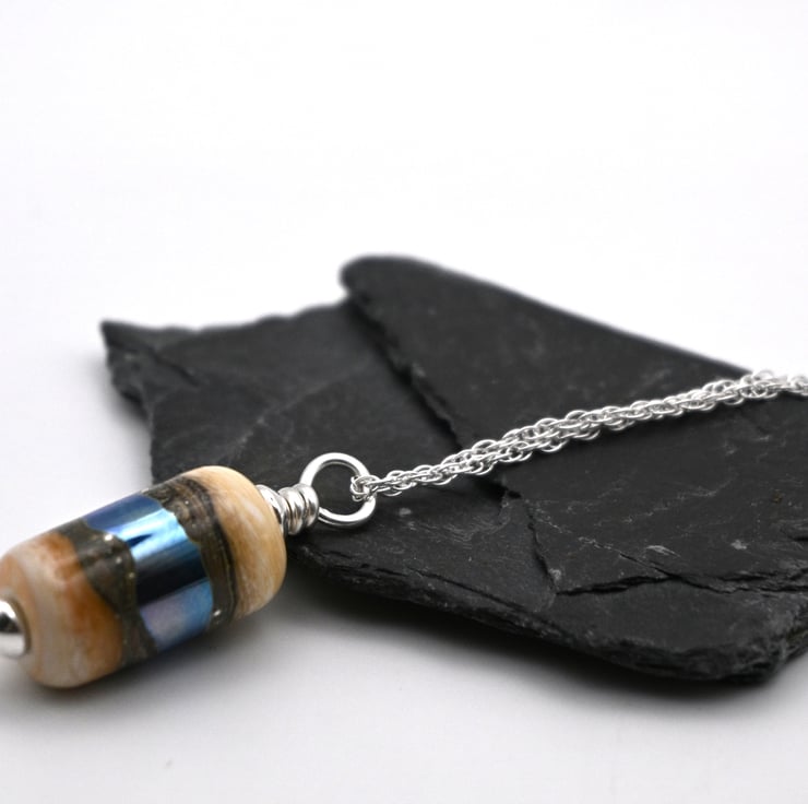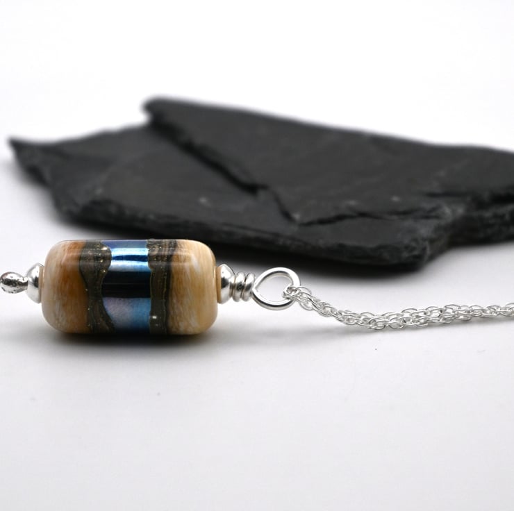 A sterling silver chain which features a handmade lampwork glass pendant.