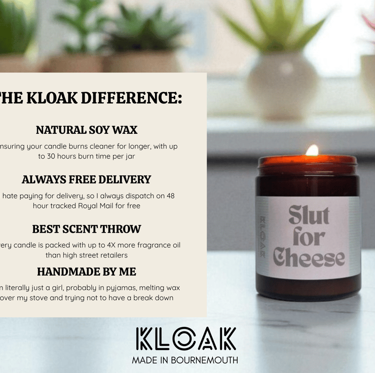 Kloak Candles started in my kitchen in Bournemouth with a love of cosy spaces, funny labels, and gorgeous scents. I wanted to make candles that didn’t take themselves too seriously — ones that could make you laugh while still filling your home with a truly luxurious fragrance.