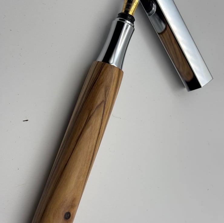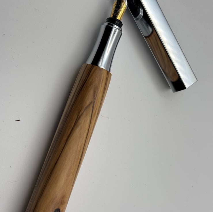 Handmade by the shop owner in his home workshop. Elevate your writing experience with a unique blend of modern design and timeless tradition. This handcrafted fountain pen is a true statement piece, perfect for anyone who appreciates quality and history. The fittings are in chrome plating and this is the actual pen you will receive. Takes standard short ink cartridge (1 included) and standard ink filler for bottled ink.