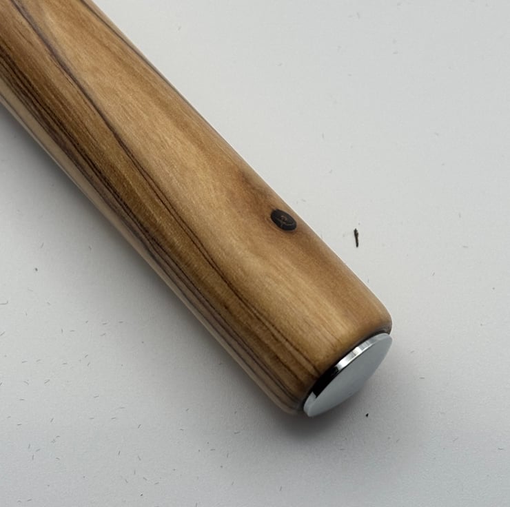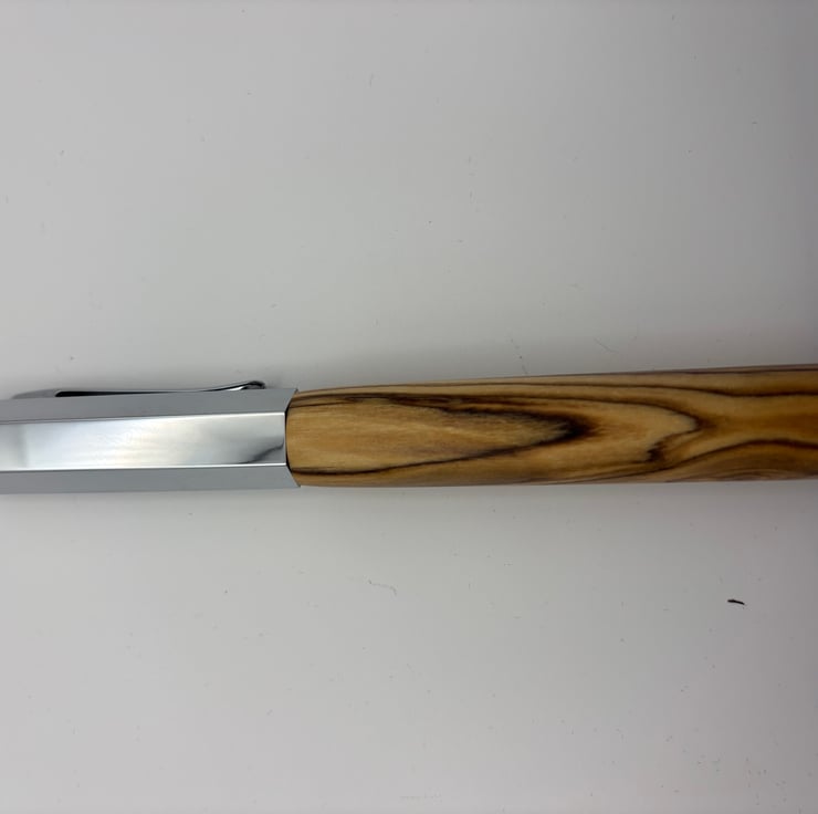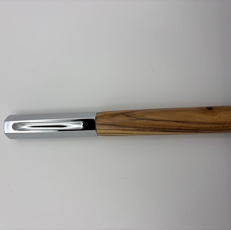 The pen features a sleek, minimalist body made from genuine, certified Bethlehem Holy Land olive wood. The rich grain and natural warmth of the wood are beautifully complemented by a modern, hexagonal metal cap, giving the pen a contemporary edge. The hexagonal shape not only looks striking but also prevents the pen from rolling off your desk.