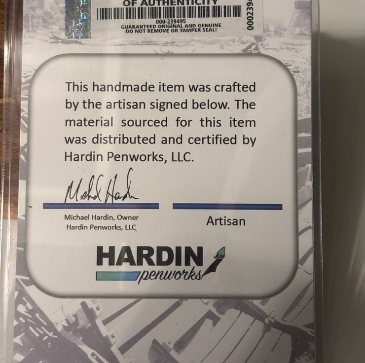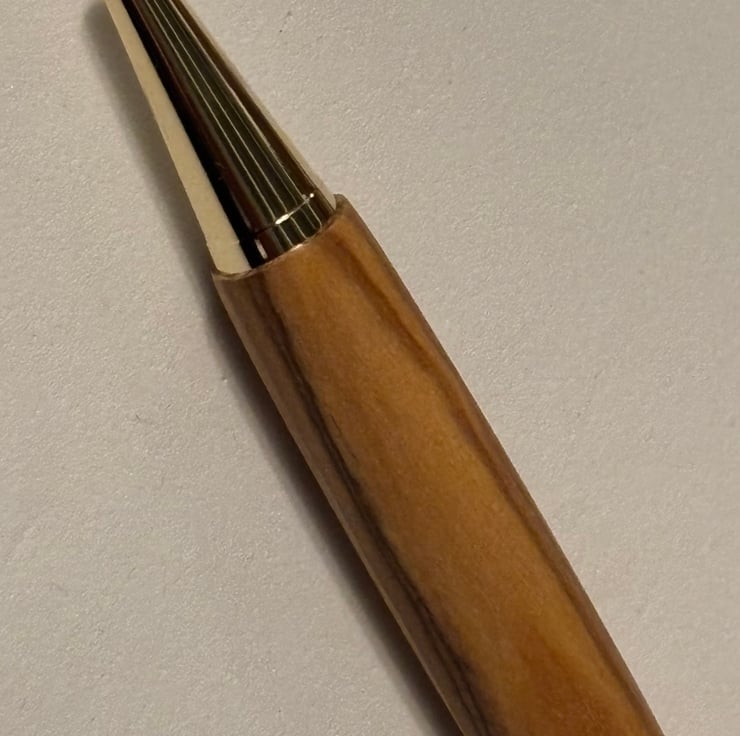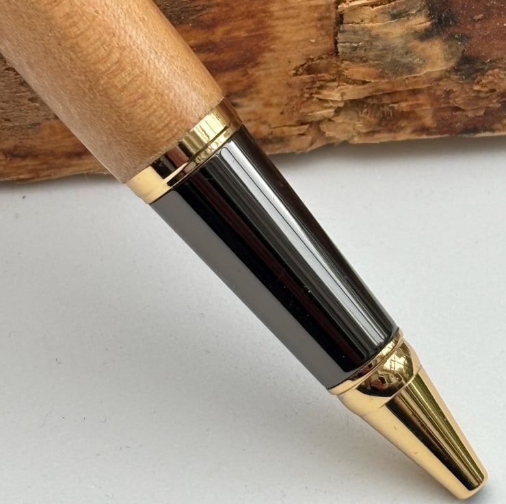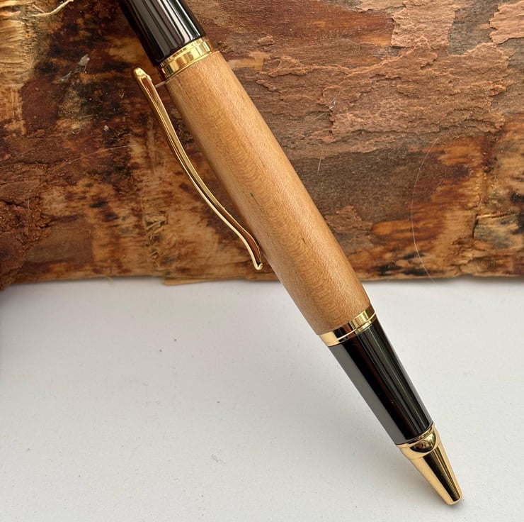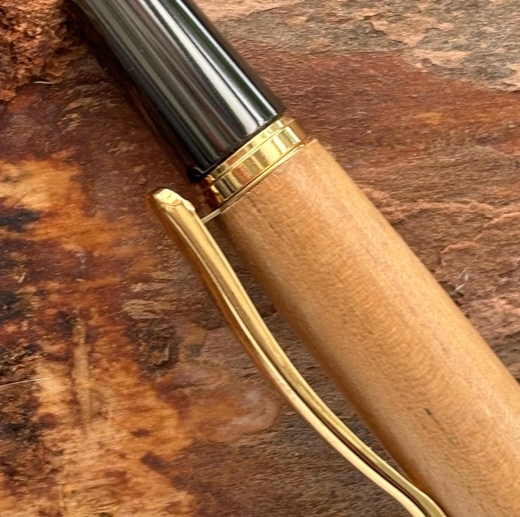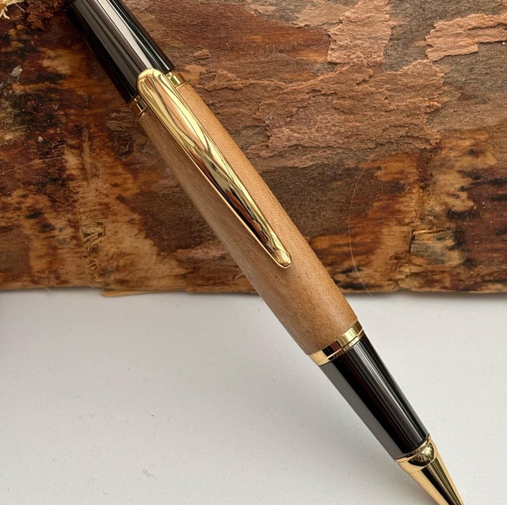 The wood is obtained from a reputable dealer in the USA and a certificate of authenticity, provided by the supplier, will be included with the pen. The metal pen parts are obtained from a UK provider, Beaufort ink, renowned worldwide for supplying premium pen parts for woodturners. The ballpoint pen is a twist action finial mechanism and can be supplied with black or blue ink.